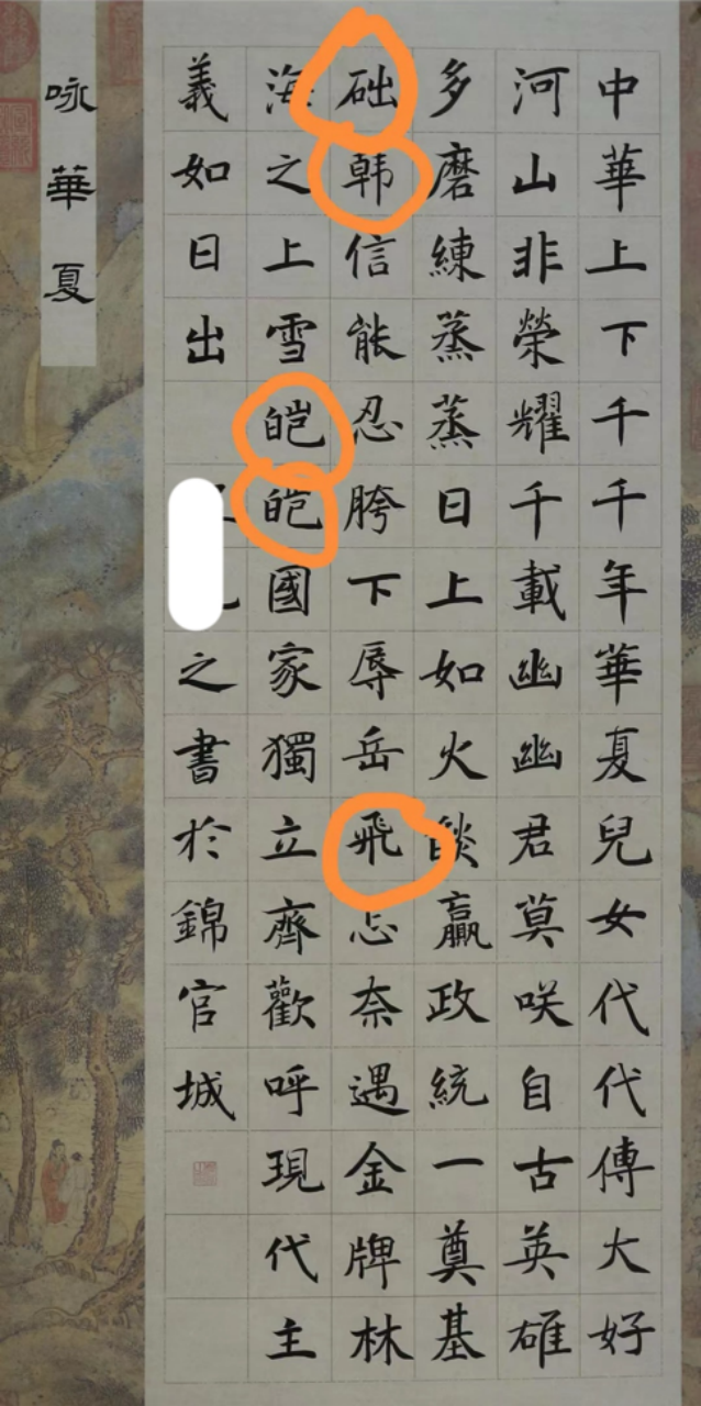 图片说明:该作品中,“础、韩、皑皑”这4个字是简体,应采用繁体字“礎、韓、皚”,“飞”为繁体,但书写错误,正确写法是“飛”。