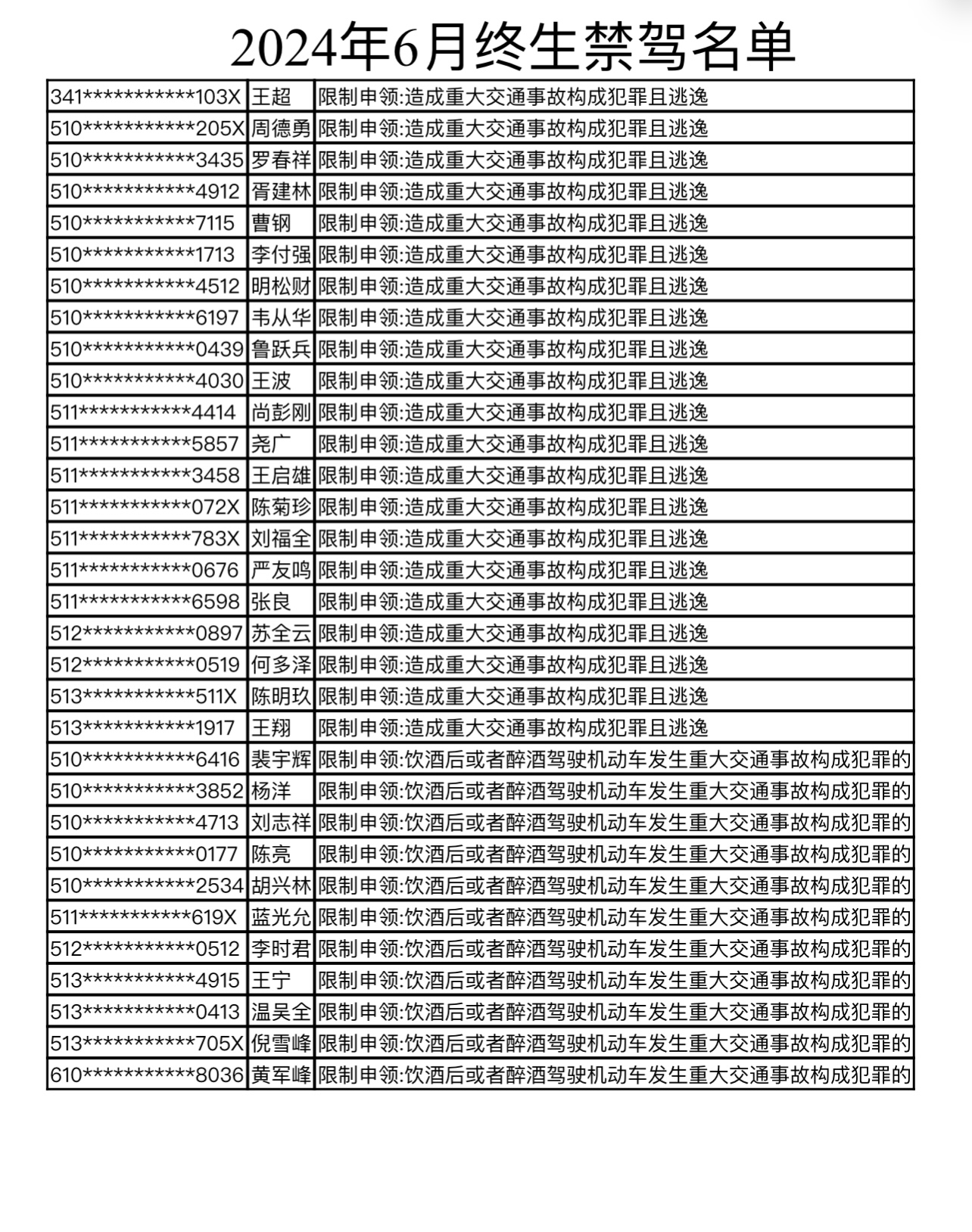 7月10日,四川省公安厅交警总队向社会集中公布了2024年6月被终生禁驾的32人名单,其中年龄最大的67岁,年龄最小的22岁。