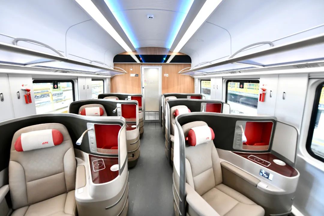 在旅客乘坐舒适性方面,商务座椅区采用大曲面造型设计,配置了电动调节、无线充电、储物台、折叠桌板、智能交互终端等,一等座和二等座座椅区设旋转座椅和小桌板,进一步提升了旅客乘车体验和出行品质。