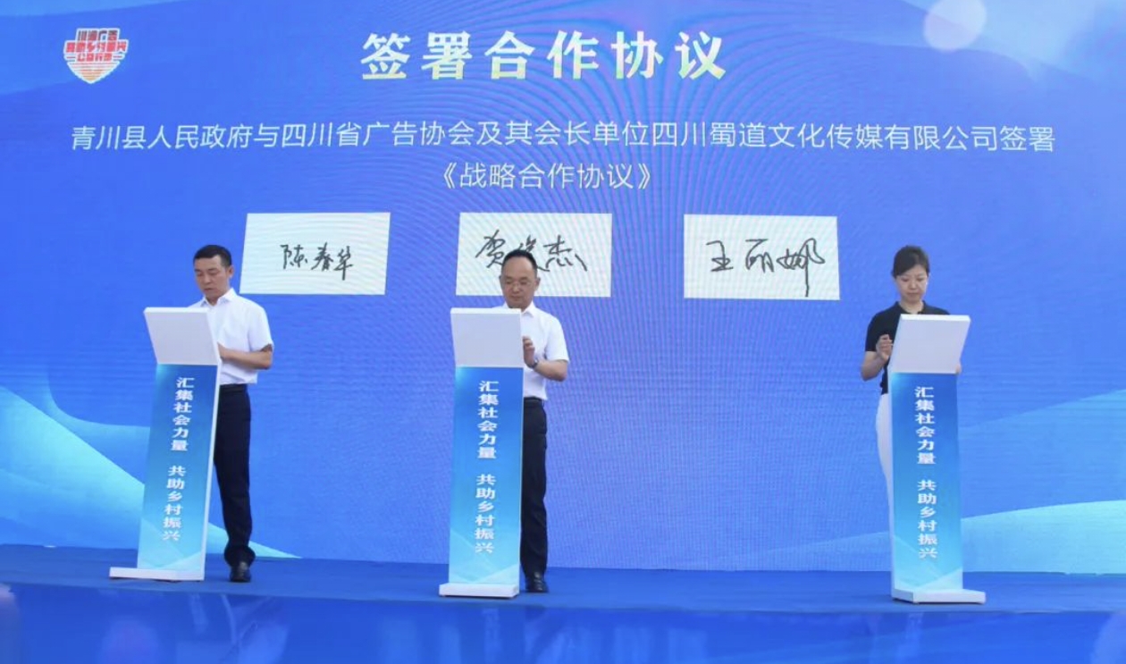 曹建奎表示,广元市支持鼓励项目企业与广告传媒企业建立长期合作,确保抓试点出亮点、变先行为先成,真正让广告助力乡村振兴成为“名片”并深入人心。他希望各与会企业了解青川县的文旅资源和特色产业,让青川的农产品、特色文旅走进更多消费者的视野,为全面推进乡村振兴、加快建设川陕甘结合部现代化中心城市贡献广告力量。青川县委副书记李磊介绍了青川县在乡村振兴发展上取得的阶段性成果,并指出青川正全力打造区域文旅康养高地、加快农特产品“出川出圈”。会中,青川县人民政府分别与四川省广告协会、四川蜀道文化传媒有限公司签订了《战略合作协议》。