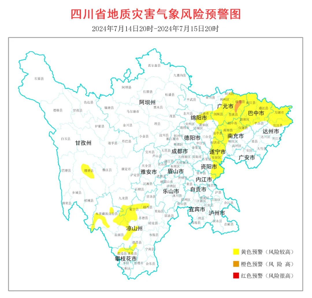 另一方面,四川省地质灾害防治指挥部办公室发布7月14日20时至7月15日20时全省地质灾害气象风险预警,具体如下: