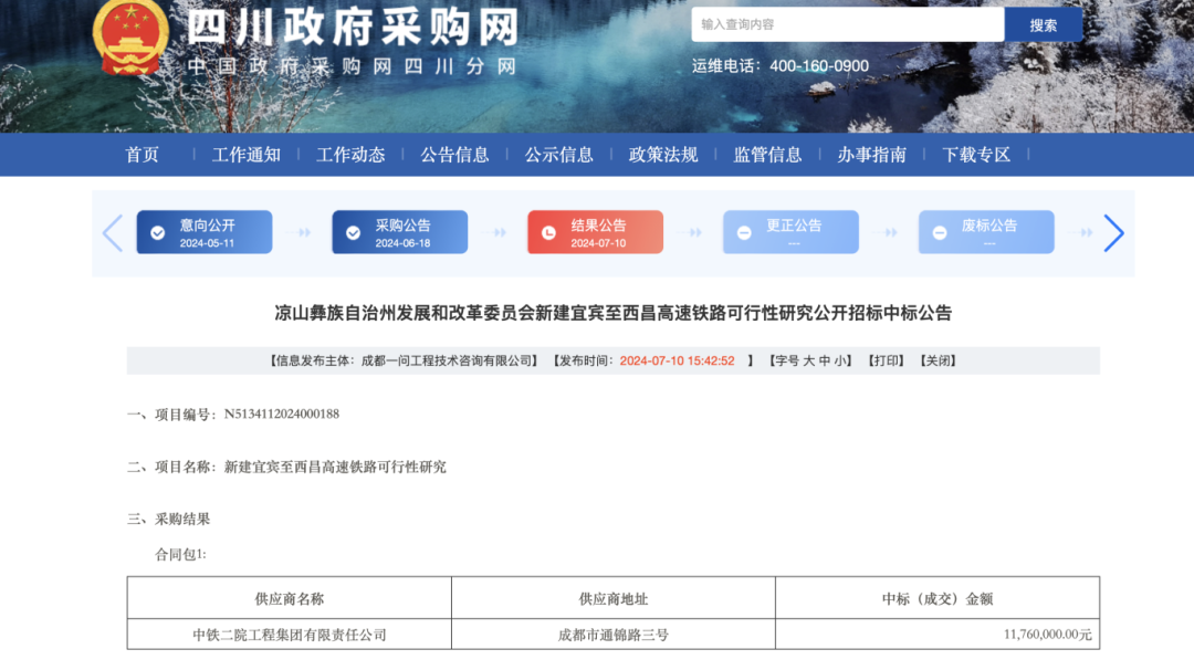 7月14日,记者从四川政府采购网获悉,7月10日,凉山彝族自治州发展和改革委员会《新建宜宾至西昌高速铁路可行性研究公开招标中标公告》发布,将正式启动项目可行性研究工作。中铁二院工程集团有限责任公司以1176万元中标该项目。