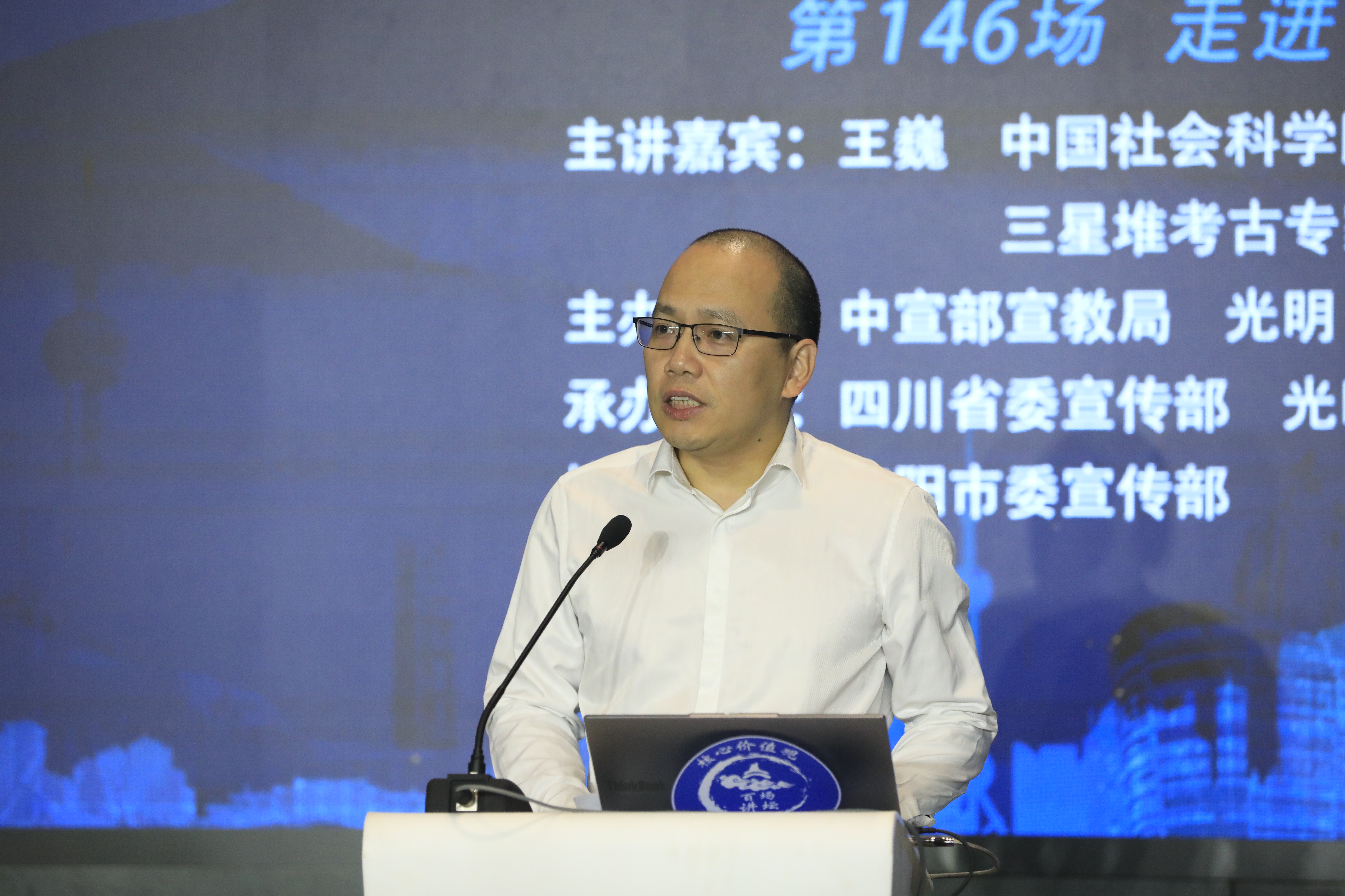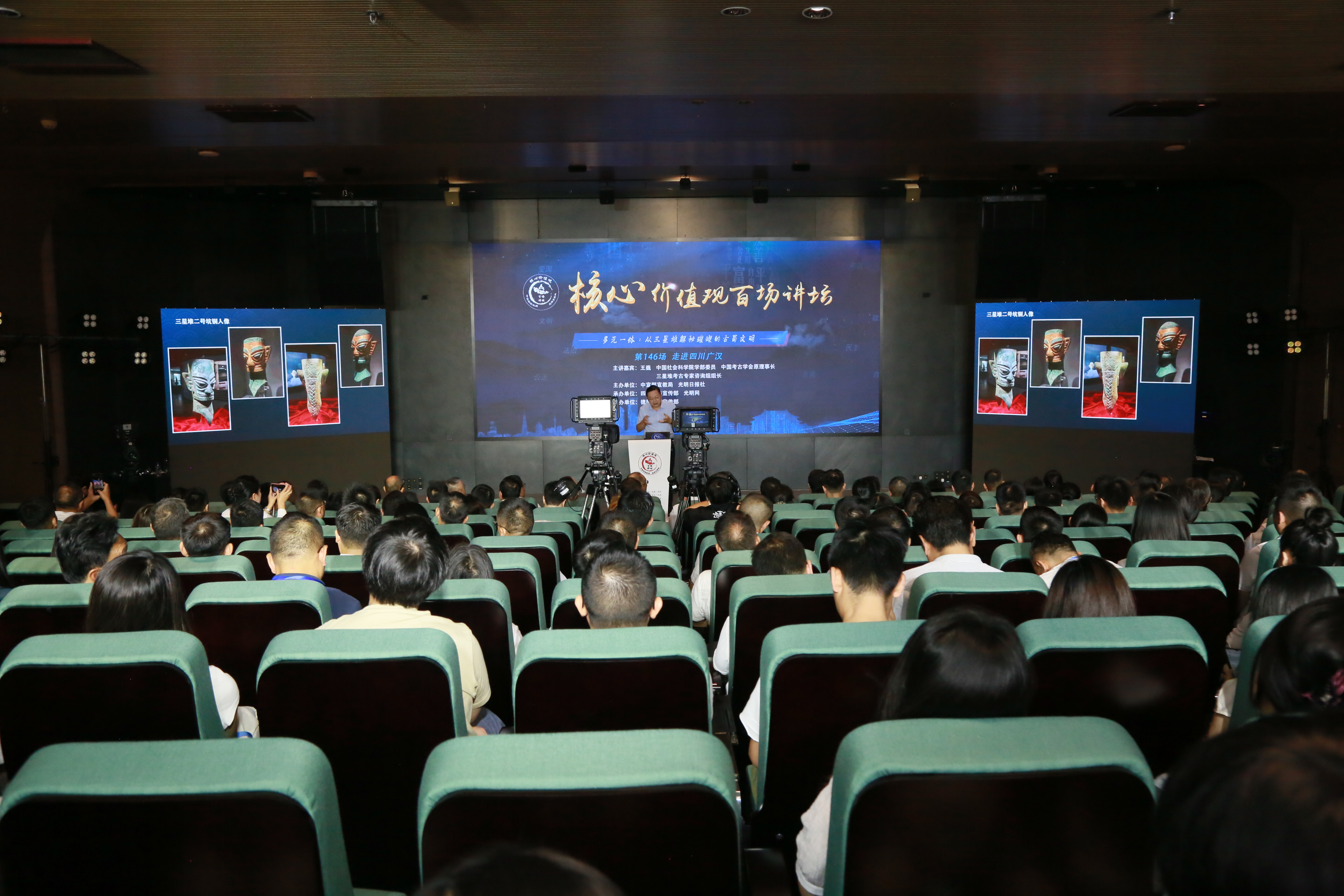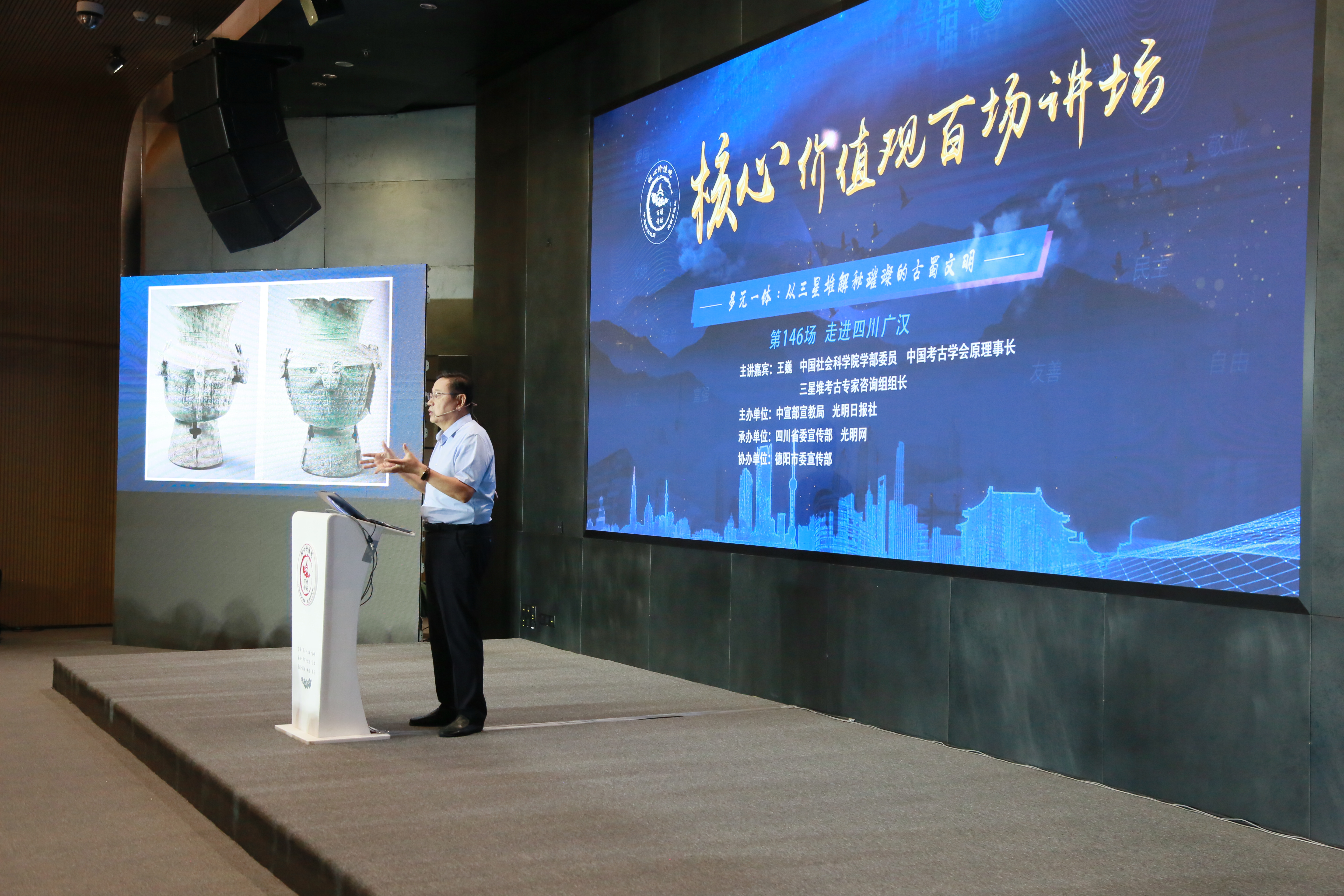 四川发布客户端消息 近日,由中宣部宣教局、光明日报社共同主办的“核心价值观百场讲坛”第146场活动12日在四川省广汉市三星堆博物馆举行。中国社会科学院学部委员,中国考古学会原理事长,三星堆考古专家咨询组组长王巍作了题为《多元一体:从三星堆解秘璀璨的古蜀文明》的演讲。