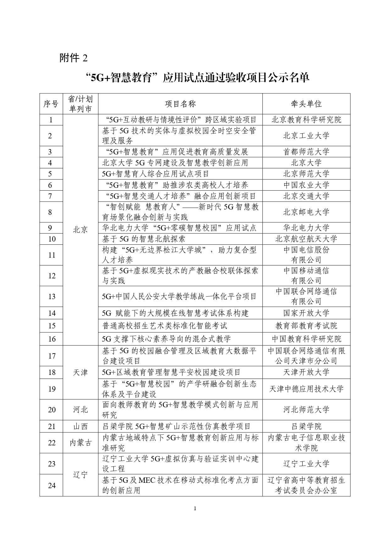 “5G+智慧教育”应用试点通过验收项目公示名单
