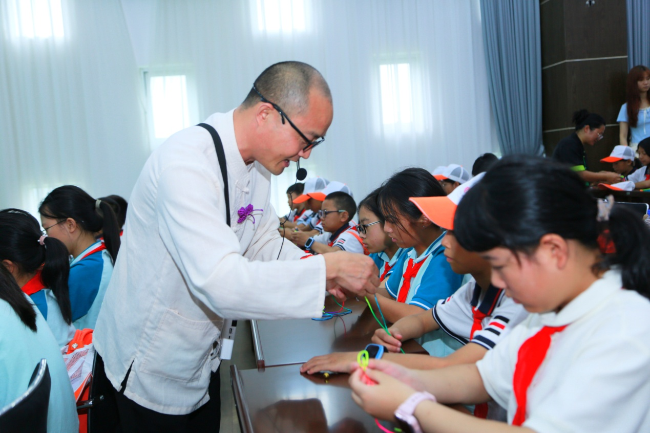 “大家拿起绳子的两端,然后用这样的方式把绳子绕成一个圈……”在四川省非物质文化遗产保护中心,同学们体验了成都市非物质文化遗产代表性项目“新津绳编”的制作技艺,现场制作“五彩手绳”。经过老师的讲解,同学们拿起五彩斑斓的绳子,学习不同绳结的编法,不一会儿,一个个吉祥结就编织完成了。同学们纷纷戴上自己亲手编织的手绳,感受着劳动和艺术带来的快乐。