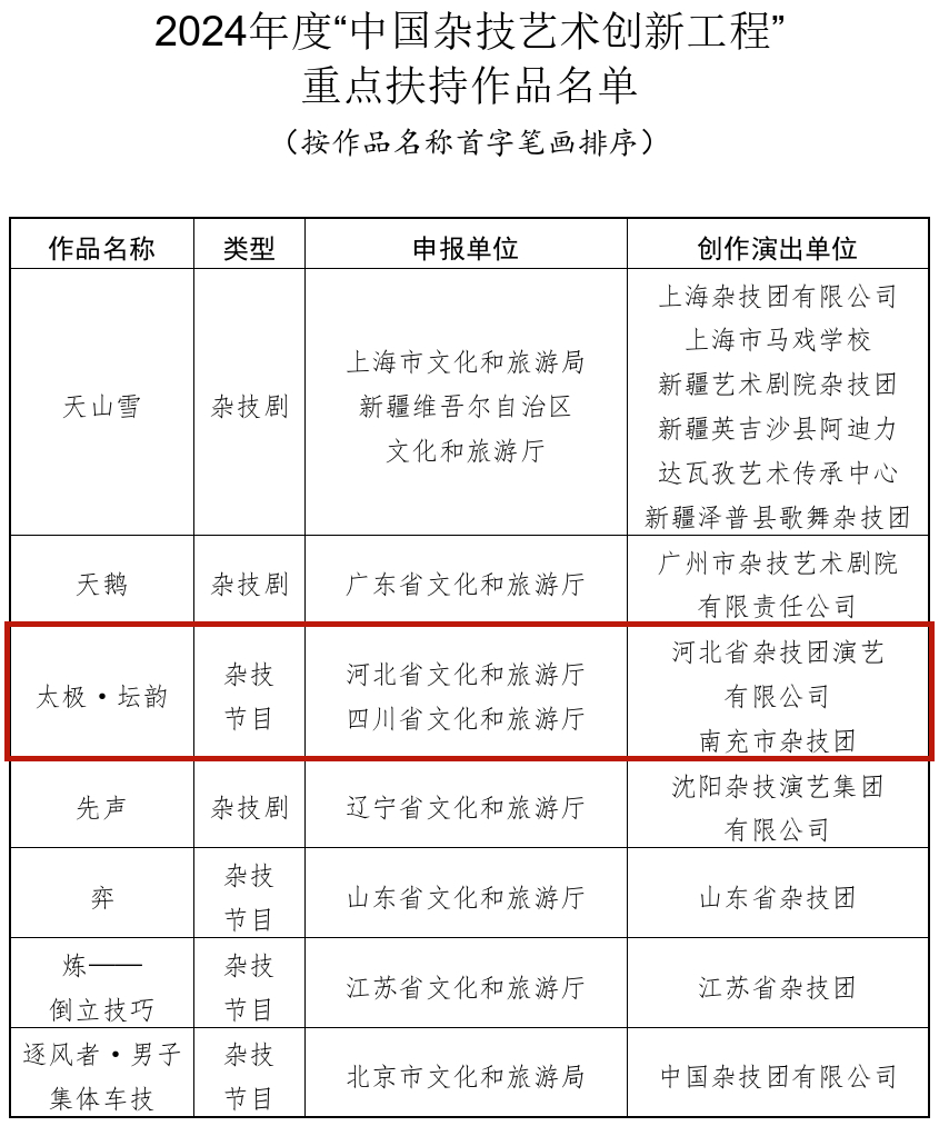 四川发布客户端消息 记者从文化和旅游部网站获悉,7月16日,文化和旅游部办公厅发布通知,公布2024年度“中国杂技艺术创新工程”重点扶持作品名单,全国共7部(个)作品入选。其中,由河北省文化和旅游厅、四川省文化和旅游厅申报的杂技节目《太极·坛韵》入选。