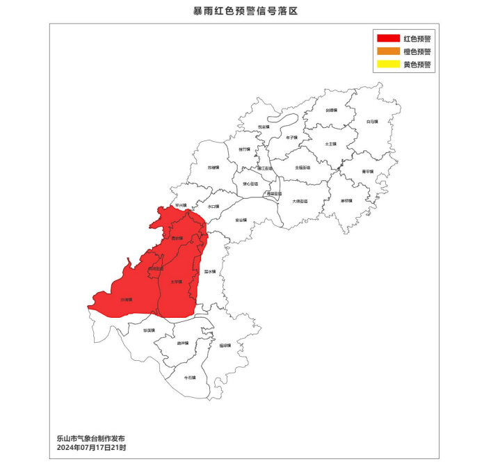 市中区平兴镇、安谷镇、水口镇,沙湾区踏水镇、轸溪镇、太平镇、嘉农镇、沙湾镇、铜河街道等乡镇(街道)3小时降雨量将达100毫米以上(或降雨强度将达70毫米/小时以上),请注意防范。