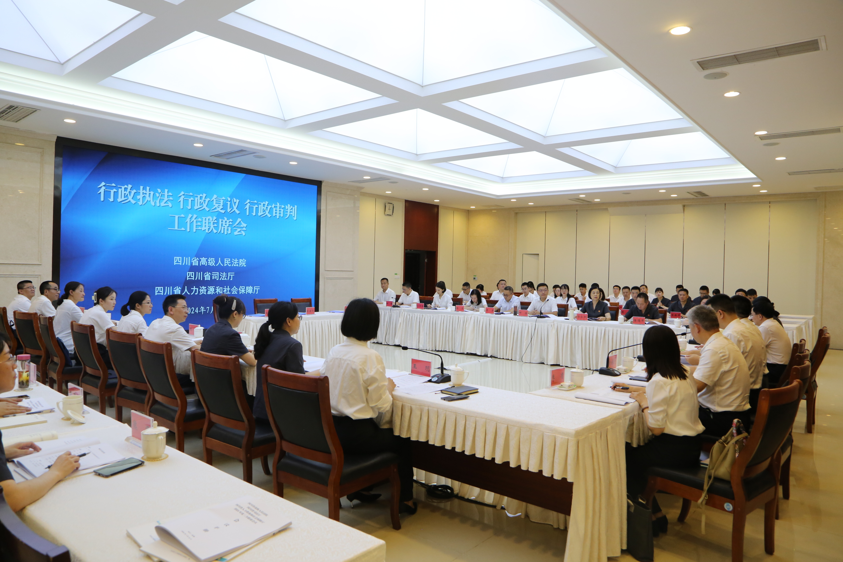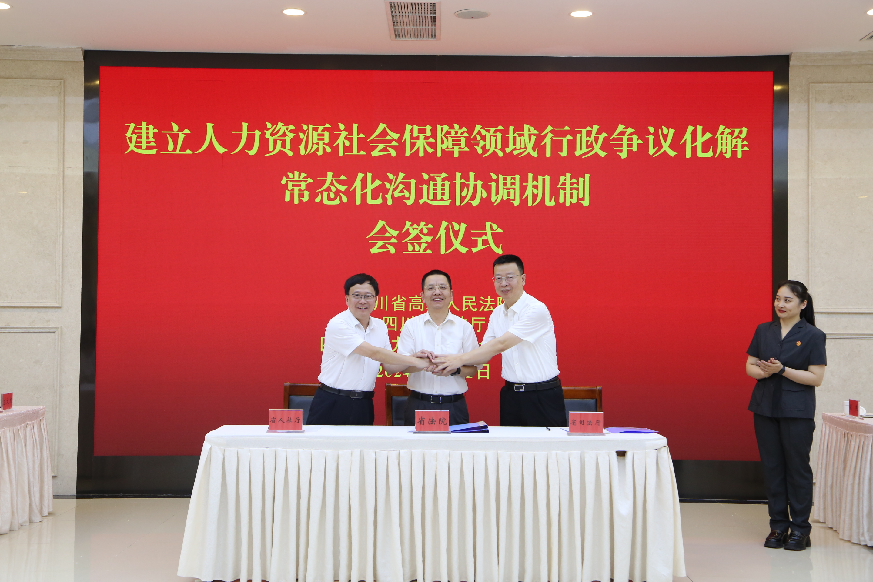 会上,三方联合发布人力资源社会保障行政执法、行政复议、行政审判典型案例,会签《关于建立人力资源社会保障领域行政争议化解常态化沟通协调机制的意见》。省法院、司法厅分别通报2023年度人力资源社会保障行政审判、行政复议工作情况。遂宁市人力资源和社会保障局、绵阳市司法局、成都中院围绕提升人力资源社会保障领域行政执法水平、促进争议实质化解、深化府院联动、创新行政审判机制作交流发言。
