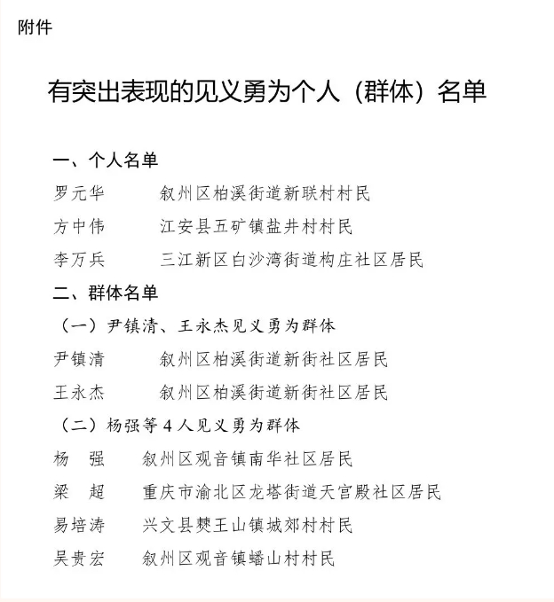 近年来,全市上下坚持以习近平新时代中国特色社会主义思想为指导,深入学习贯彻党的二十大精神,大力弘扬社会主义核心价值观,在加快建设平安宜宾过程中,涌现出一批见义勇为先进典型。他们不顾个人安危,不惜牺牲个人利益,保护公共利益和人民群众生命财产安全,为全社会作出了表率、树立了榜样,谱写了新时代的正气之歌。为激励先进、树立典型,根据《四川省保护和奖励见义勇为条例》《宜宾市保护和奖励见义勇为管理办法》,市政府决定对罗元华等有突出表现的3名见义勇为个人、2个见义勇为群体授予“宜宾市见义勇为勇士”“宜宾市见义勇为先进群体”称号并给予奖励。