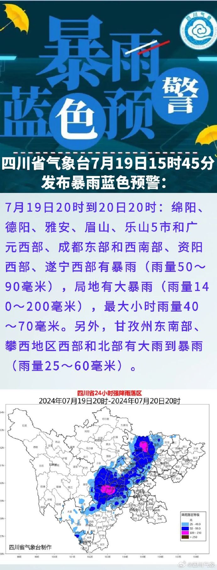 四川发布客户端消息 从四川气象获悉,四川省气象台7月19日15时45分发布暴雨蓝色预警: