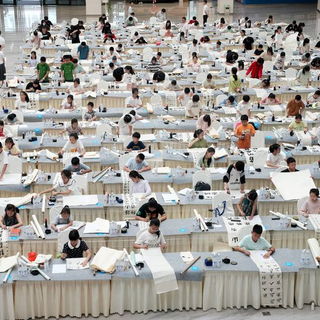 比赛开始前一个小时,选手们有序入场,准备书画比拼的用具。备墨、裁纸、开笔,是基本功,也是赛前平复心情的好方式。选手们娴熟地调整着自己的文具,好整以暇,静待开赛指令。
