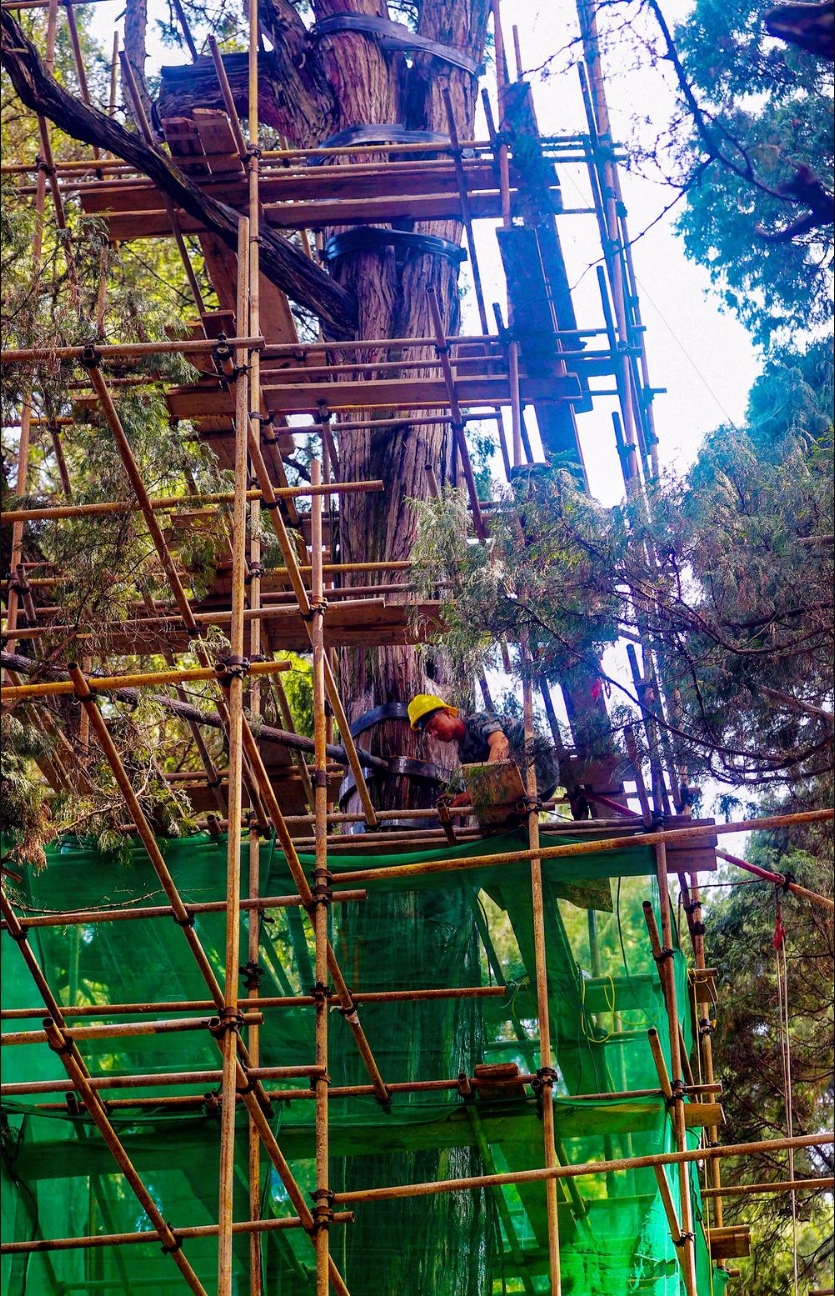 此外,针对古柏存在的虫害、水土流失、自然衰老等问题,剑阁县创新建立蜀道古树保护“林长+树长”模式,广泛开展“校+院+地”等合作,对长势衰弱的古柏采取地上环境综合治理、地下土壤改良等救护复壮措施进行辨症施治,全力以赴让长势衰弱的古柏焕发出新的生机。同时,对蜀柏毒蛾、云南松毛虫、白蚁等主要古柏病虫害,采用药物飞防、人工烟剂和物理综合防治,悉心守护古柏健康。