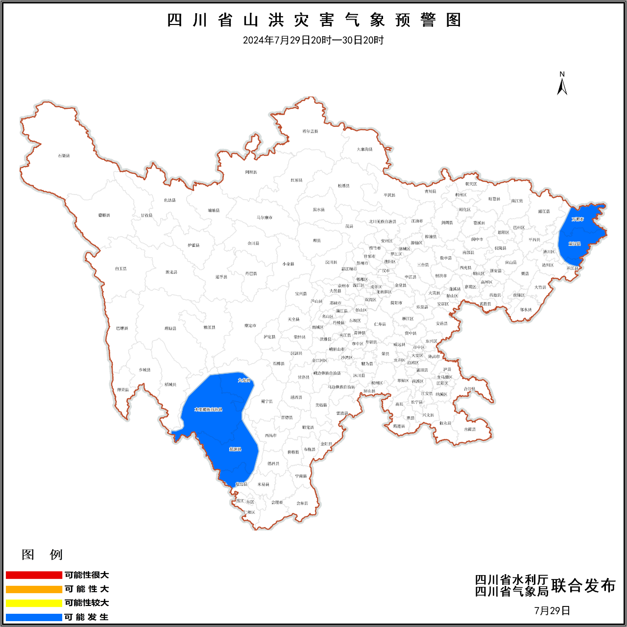 2024年7月29日20时至30日20时,攀枝花市盐边,达州市宣汉、开江、万源,甘孜州九龙,凉山州木里、盐源等7个县(市、区)可能发生山洪灾害。