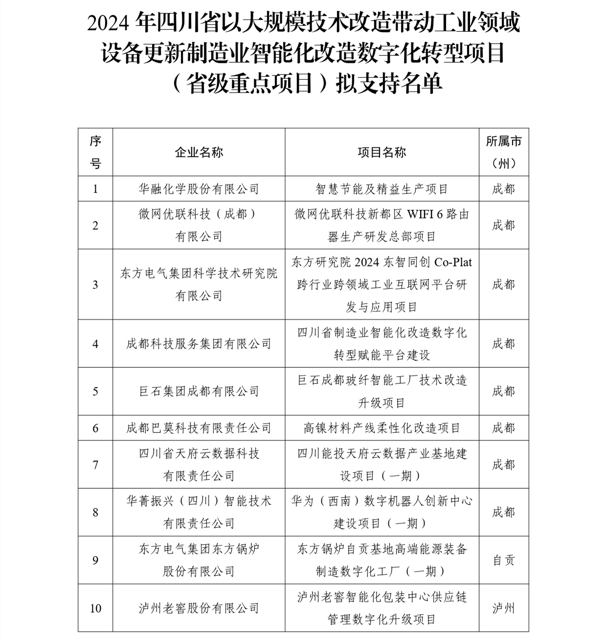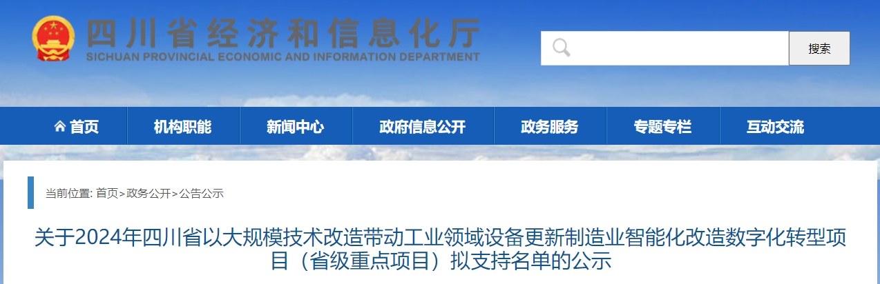 四川发布客户端消息 7月31日,四川省经济和信息化厅网站公示2024年四川省以大规模技术改造带动工业领域设备更新制造业智能化改造数字化转型项目(省级重点项目)拟支持名单,公示时间为2024年7月31日至8月7日。