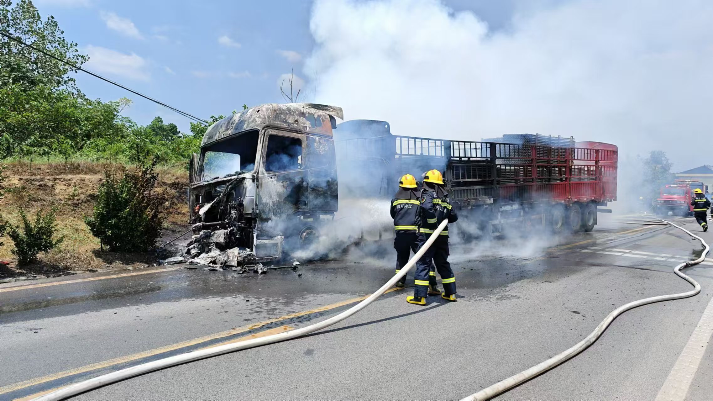 四川发布客户端消息 记者从内江市消防救援支队获悉,7月31日12时许,内江市资中县鱼溪镇G321国道高楼至鱼溪路段一辆挂车在行驶途中不慎将右前轮掉入路边排水沟,随后车辆在高温摩擦下起火,火势迅速蔓延。接到报警后,资中县球溪镇政府专职消防救援站立即前往现场展开救援。