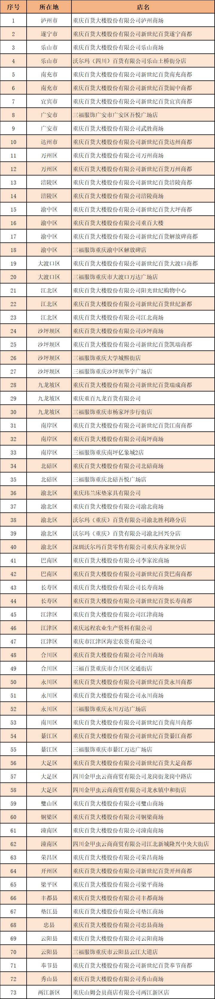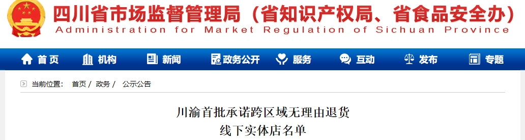 日前,四川省市场监督管理局、重庆市市场监督管理局联合公布首批73家承诺跨区域无理由退货线下实体店名单,具体如下: