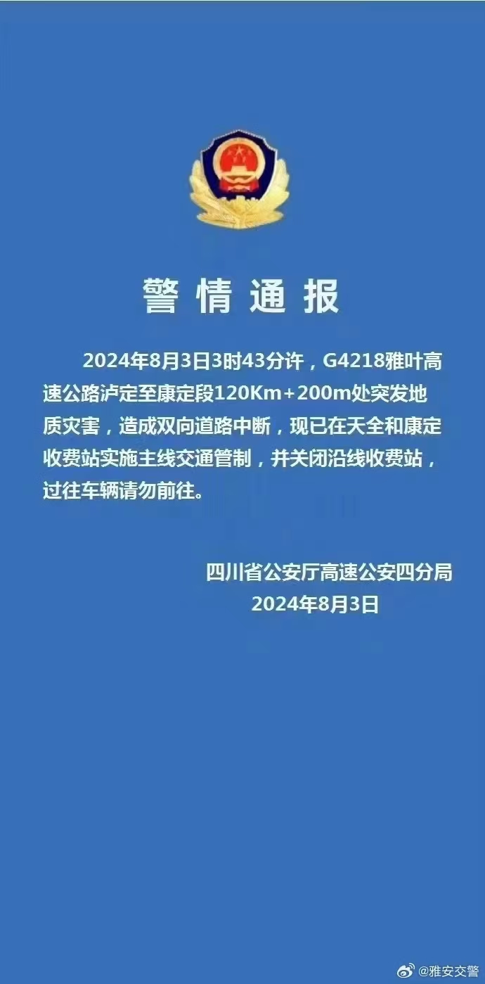四川发布客户端消息 今日,从四川高速交警四支队官微获悉,8月3日凌晨,G4218雅叶高速公路泸定至康定段120Km+200m处突发地质灾害,造成双向道路中断,现已在天全和康定收费站实施主线交通管制,并关闭沿线收费站。过往车辆请勿前往。