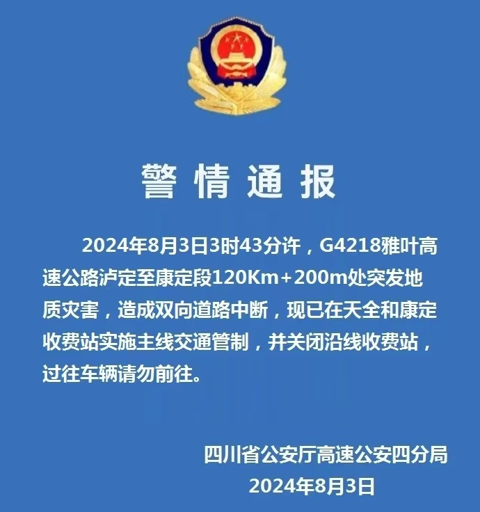 四川发布客户端消息 记者从四川高速公安四分局获悉,2024年8月3日凌晨,G4218雅叶高速公路泸定至康定段120Km+200m处突发地质灾害,造成双向道路中断,现已在天全和康定收费站实施主线交通管制,并关闭沿线收费站,过往车辆请勿前往。