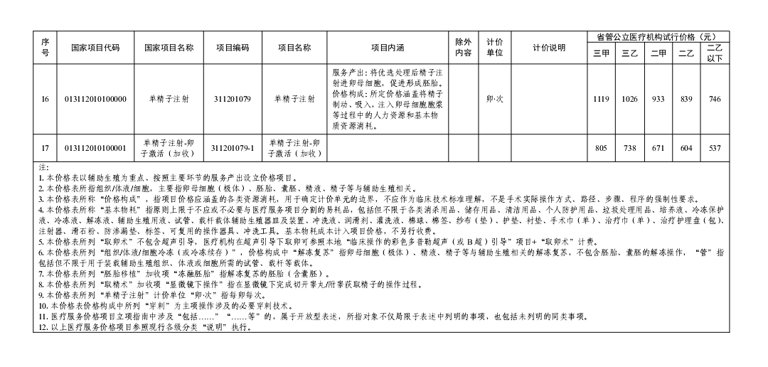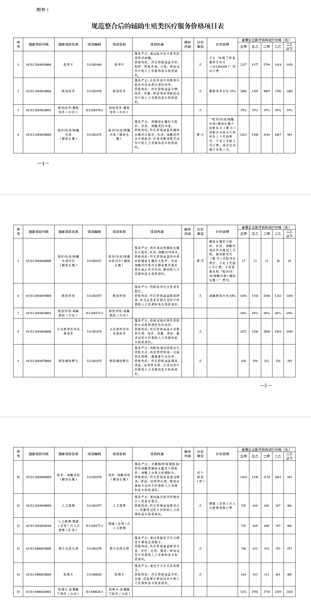 医疗服务价格项目政策方面,全省新增 17 个辅助生殖类医疗服务价格项目(见附件 1),同时停用原有 24 个辅助生殖类医疗服务价格项目(见附件 2)。