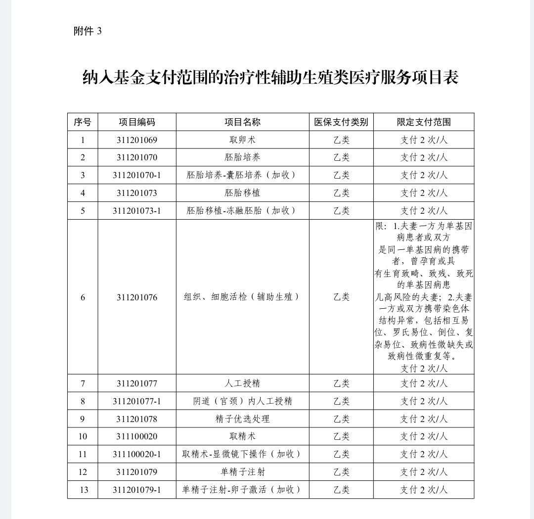 医保支付政策方面,规定经卫生健康部门批准开展人类辅助生殖技术的定点医疗机构,严格按照卫生健康部门人类辅助生殖技术规范为符合条件的参保人员提供辅助生殖技术服务。将“取卵术”等 13 项治疗性辅助生殖类医疗服务项目纳入基本医疗保险支付范围(见附件 3)。