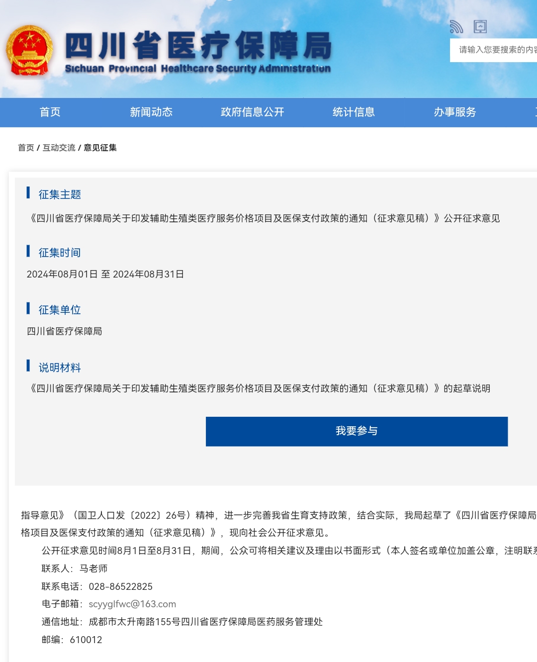 四川发布客户端消息 2024年8月01日至8月31日,四川省医疗保障局就《关于印发辅助生殖类医疗服务价格项目及医保支付政策的通知(征求意见稿) 》在官网公开征求意见。其中,明确新增了17项辅助生殖类医疗服务价格项目,并将部分治疗性辅助生殖类医疗服务项目纳入基本医疗保险基金支付范围。