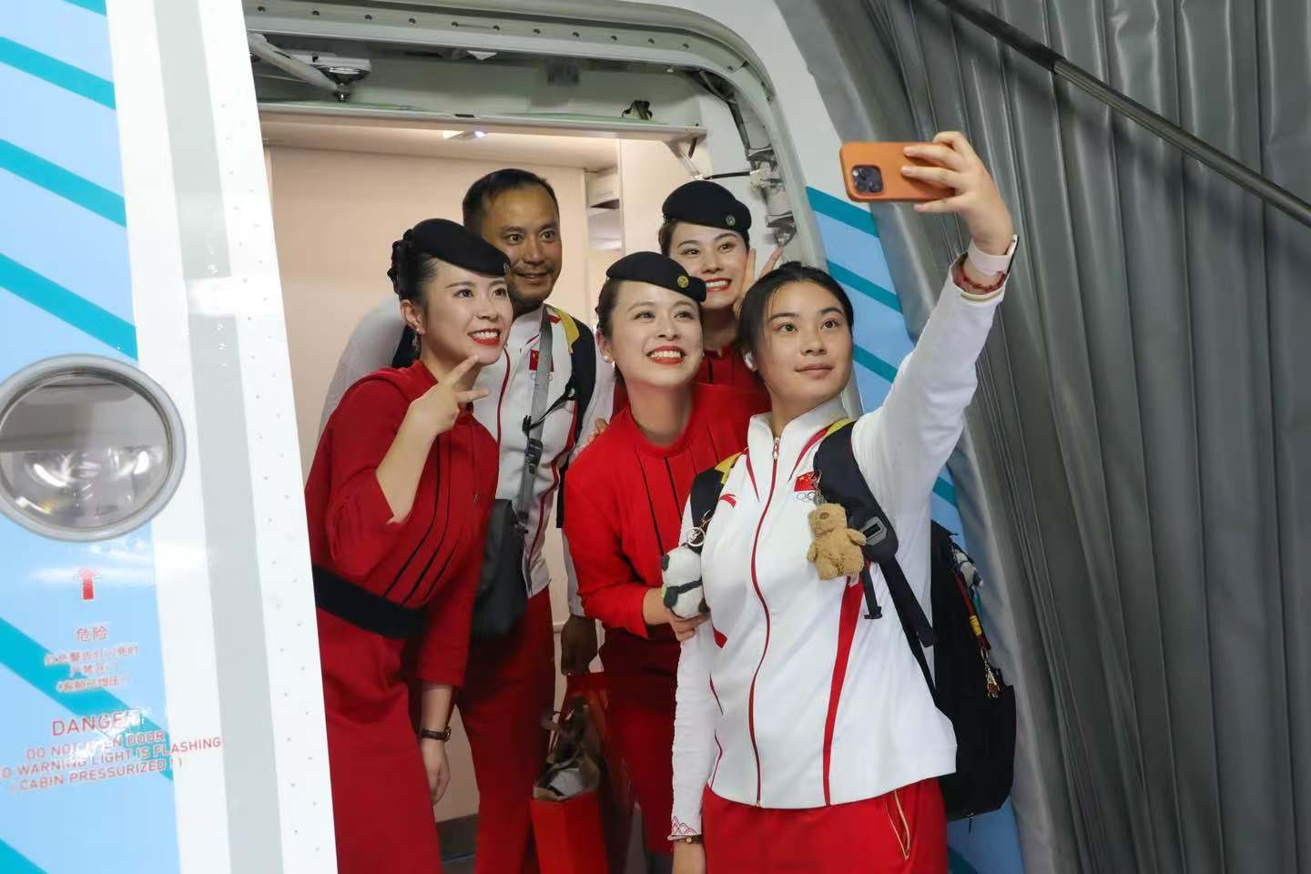 据介绍,执飞此次航班的是川航今年新引进的第八架A350熊猫涂装飞机。在地面,川航为奥运冠军团队设置了专属值机柜台及通道,并提供全程引导服务;航班上,乘务组精心准备了川味特色的“熊猫主题餐食”,并向运动员及教练赠送“熊猫涂装机模”,让冠军团队在万米高空感受来自家乡航空的热情欢迎。