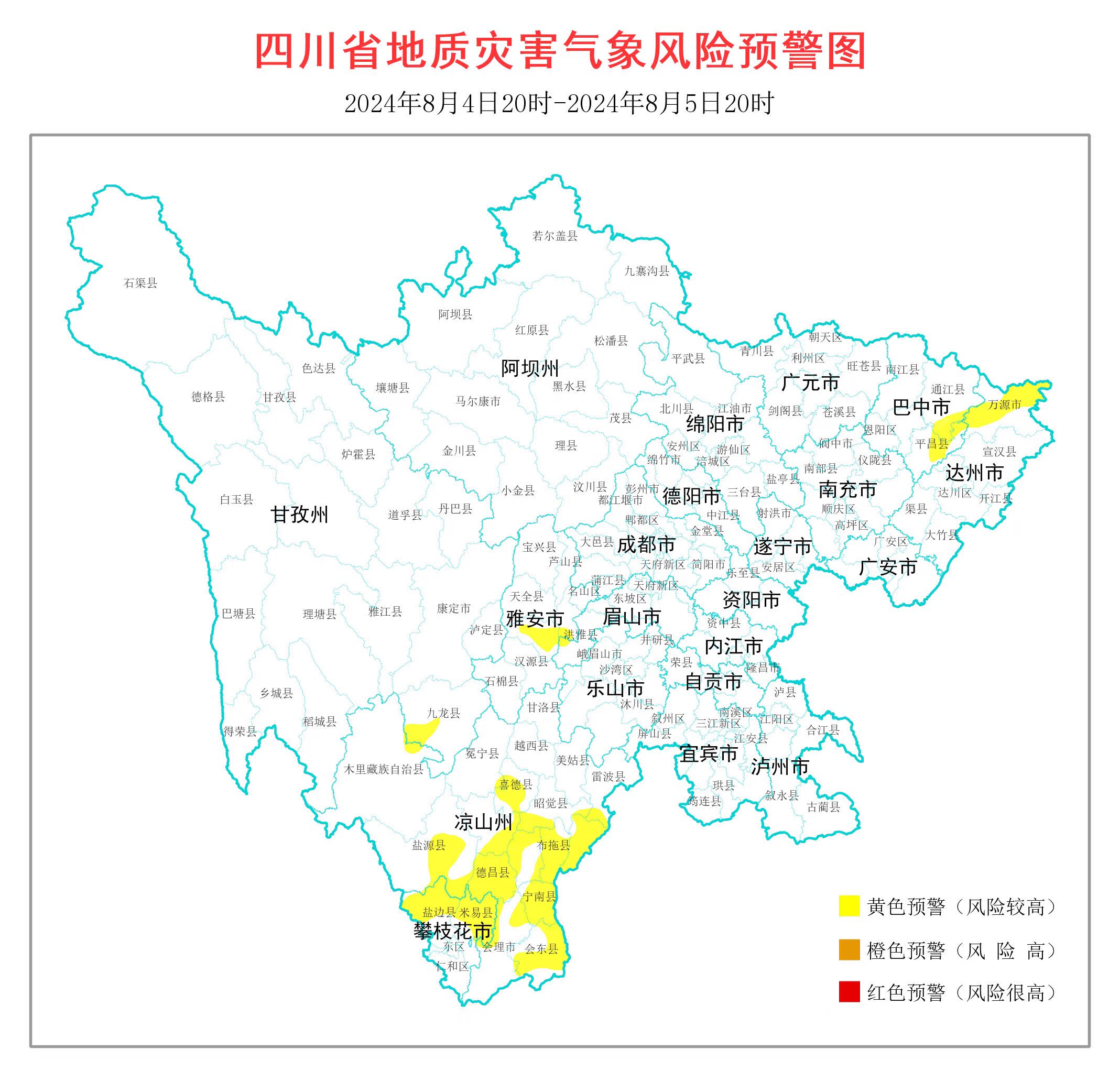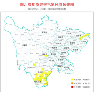 根据四川省气象台天气预报情况,结合四川省地质环境条件,四川省地质灾害防治指挥部办公室发布全省地质灾害气象风险预警(8月4日20时至8月5日20时),本次预警为3级,黄色预警,涉及23个县(市、区)。预警区域结果如下: