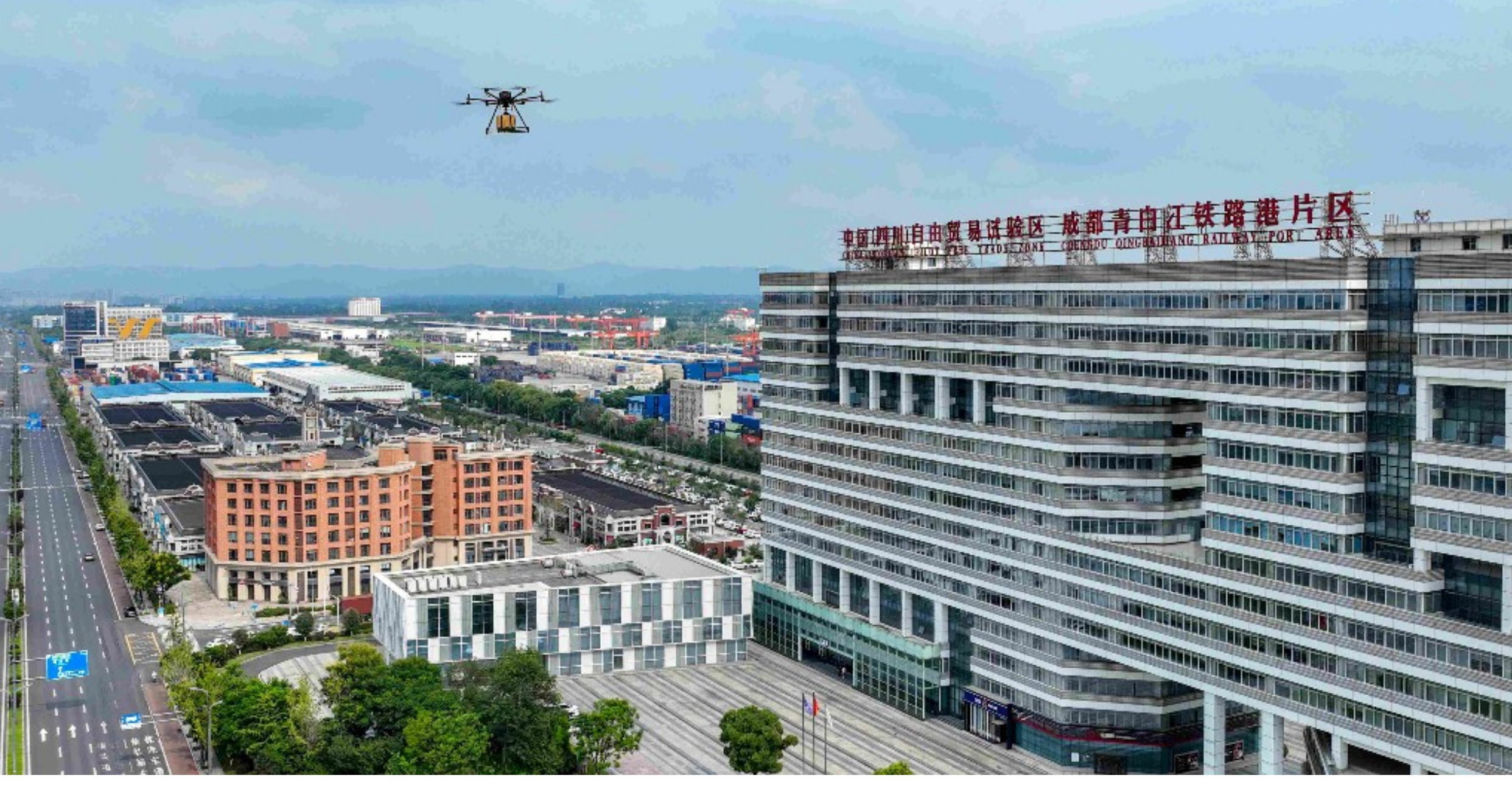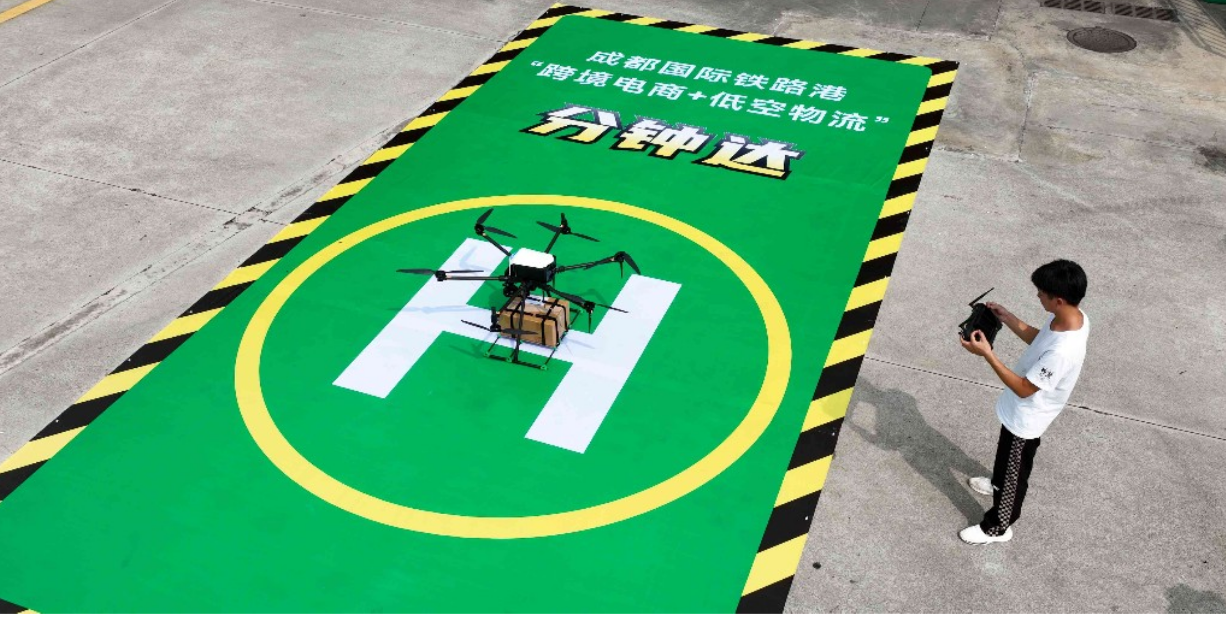 8月7日,位于成都国际铁路港综合保税区内的青铁公司仓库接到客户订单,在迅速完成拣货、打包以及海关审核清关后,工作人员将货品送上无人机,随后从成都国际铁路港综合保税区起飞,按照规划飞行线路精准降落至亚蓉欧国家(商品)馆OTO跨境体验中心店,并交付至消费者手中,整个飞行时间不到两分钟。此次飞行标志着全国首个“中欧班列+低空经济”配送模式落地成都青白江。