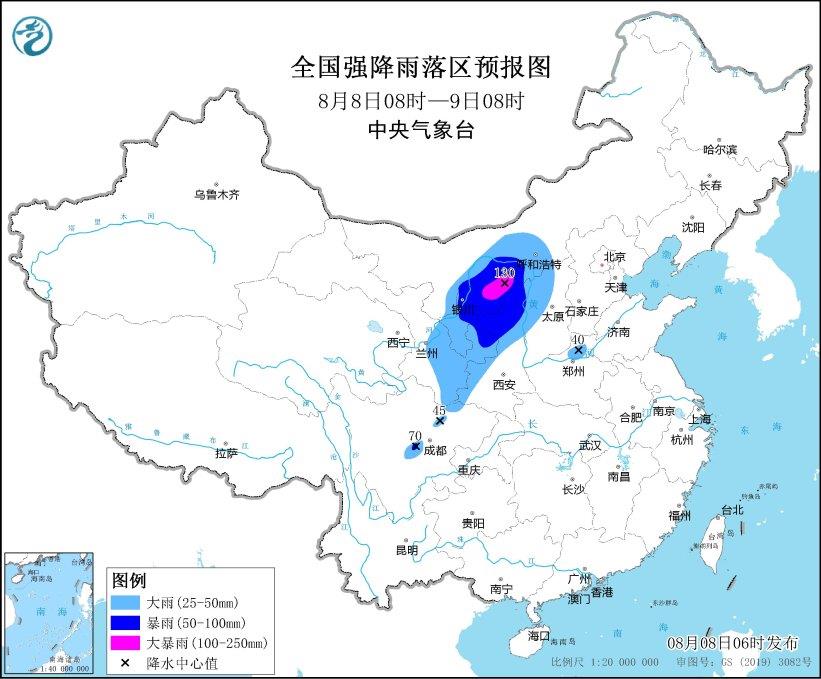 预计,8月8日8时至9日8时,甘肃东部、宁夏、内蒙古河套地区、陕西西部和北部、山西西部及四川盆地西部、河南北部等地部分地区有大到暴雨,其中,内蒙古河套地区等地部分地区有大暴雨(100~130毫米)。