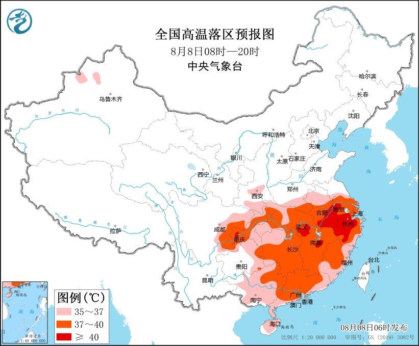 其中,四川东南部、重庆大部、河南东南部、安徽中南部、江苏中南部、上海、浙江、湖北大部、湖南大部、江西、福建中西部、广西东部、广东中北部等地部分地区最高气温37℃以上,安徽南部、江苏西南部、浙江中西部等地局地可达40℃以上。