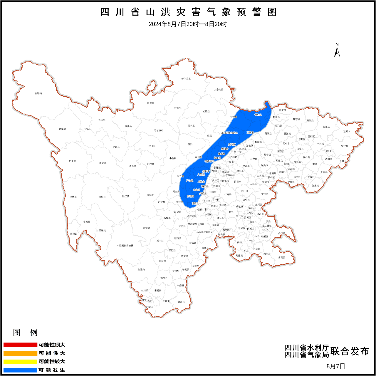 2024年8月7日20时至8日20时,成都市大邑、蒲江、都江堰、彭州、邛崃、崇州,德阳市什邡、绵竹,绵阳市涪城、安州、北川、平武、江油,广元市利州、青川、剑阁,眉山市洪雅、丹棱,雅安市雨城、名山、荥经、天全、芦山、宝兴,阿坝州汶川、茂县等26个县(市、区)可能发生山洪灾害。