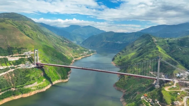 川滇金沙江特大桥为G4216线宜攀高速控制性工程,主跨1060米单跨双塔钢桁梁悬索桥,地处高地震烈度区(Ⅷ度),是世界第一座同时跨越超复杂风场、超高地震烈度带以及深水库区的千米级钢桁梁悬索桥。大桥飞跨川滇两省,两座索塔分别位于四川省宁南县和云南省巧家县,主桥横跨世界第二大水电站白鹤滩水电站库区,是四川通向云南的重点在建工程项目。