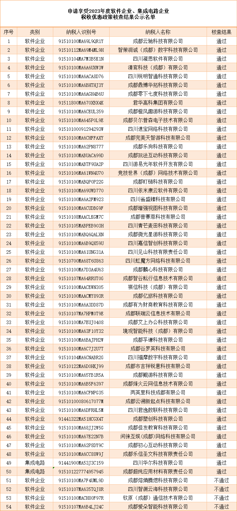 申请享受2023年度软件企业、集成电路企业税收优惠政策核查结果公示名单
