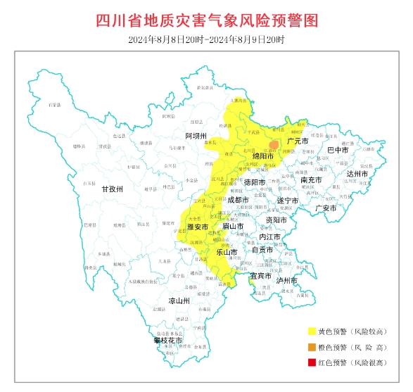 另一方面,四川省地质灾害防治指挥部办公室发布8月8日20时至8月9日20时全省地质灾害气象风险预警。详情如下: