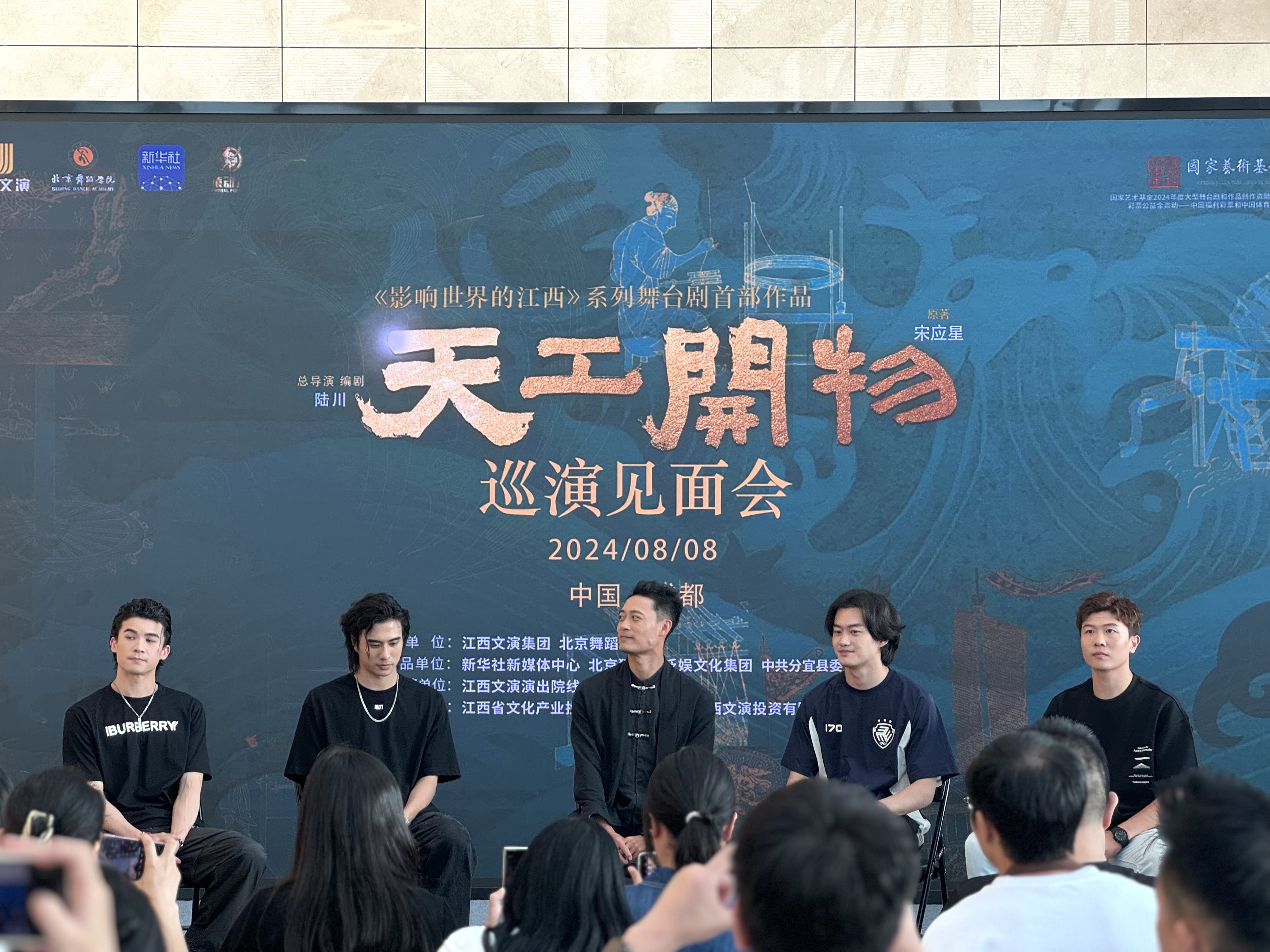 四川发布客户端消息 8月8日,陆川导演跨界融合舞台剧《天工开物》在成都举办巡演见面会。现场,主演魏伸洲、马蛟龙、吕科镝、胡适、姚亮等优秀青年演员进行了剧目推介,并与观众进行互动。