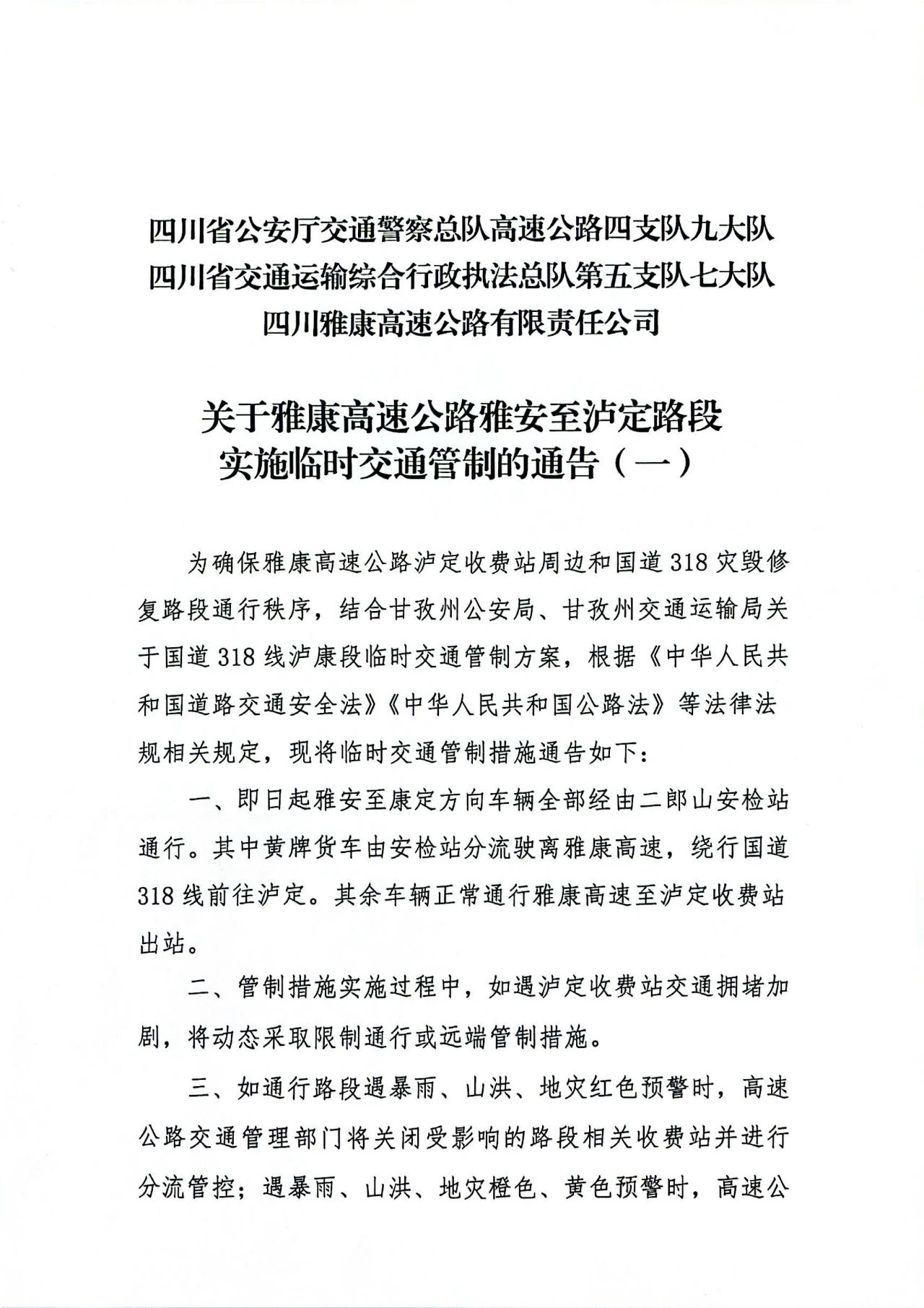 为确保雅康高速公路泸定收费站周边和国道318灾毁修复路段通行秩序,结合甘孜州公安局、甘孜州交通运输局关于国道 318线泸康段临时交通管制方案,根据《中华人民共和国道路交通安全法》《中华人民共和国公路法》等法律法规相关规定,现将临时交通管制措施通告如下: