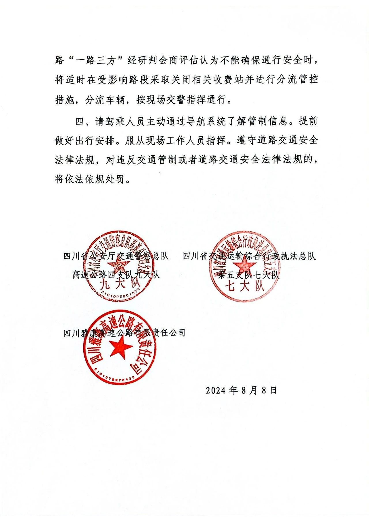 二、管制措施实施过程中,如遇泸定收费站交通拥堵加剧,将动态采取限制通行或远端管制措施。