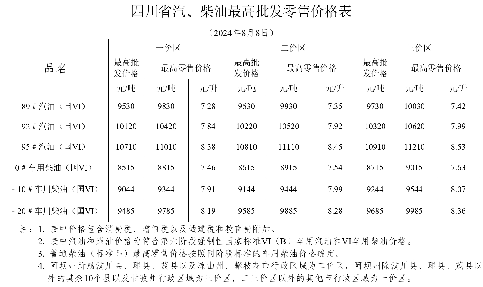 四川发布客户端消息 记者从四川省发展和改革委员会网站获悉,8月8日,四川省发展和改革委员会发布《关于降低成品油价格的通知》(简称《通知》),国家发展改革委调整并公布了中心城市汽、柴油(标准品)最高零售价格,我省三个价区汽、柴油最高零售价格相应调整,调整后的价格自2024年8月8日24时起执行。