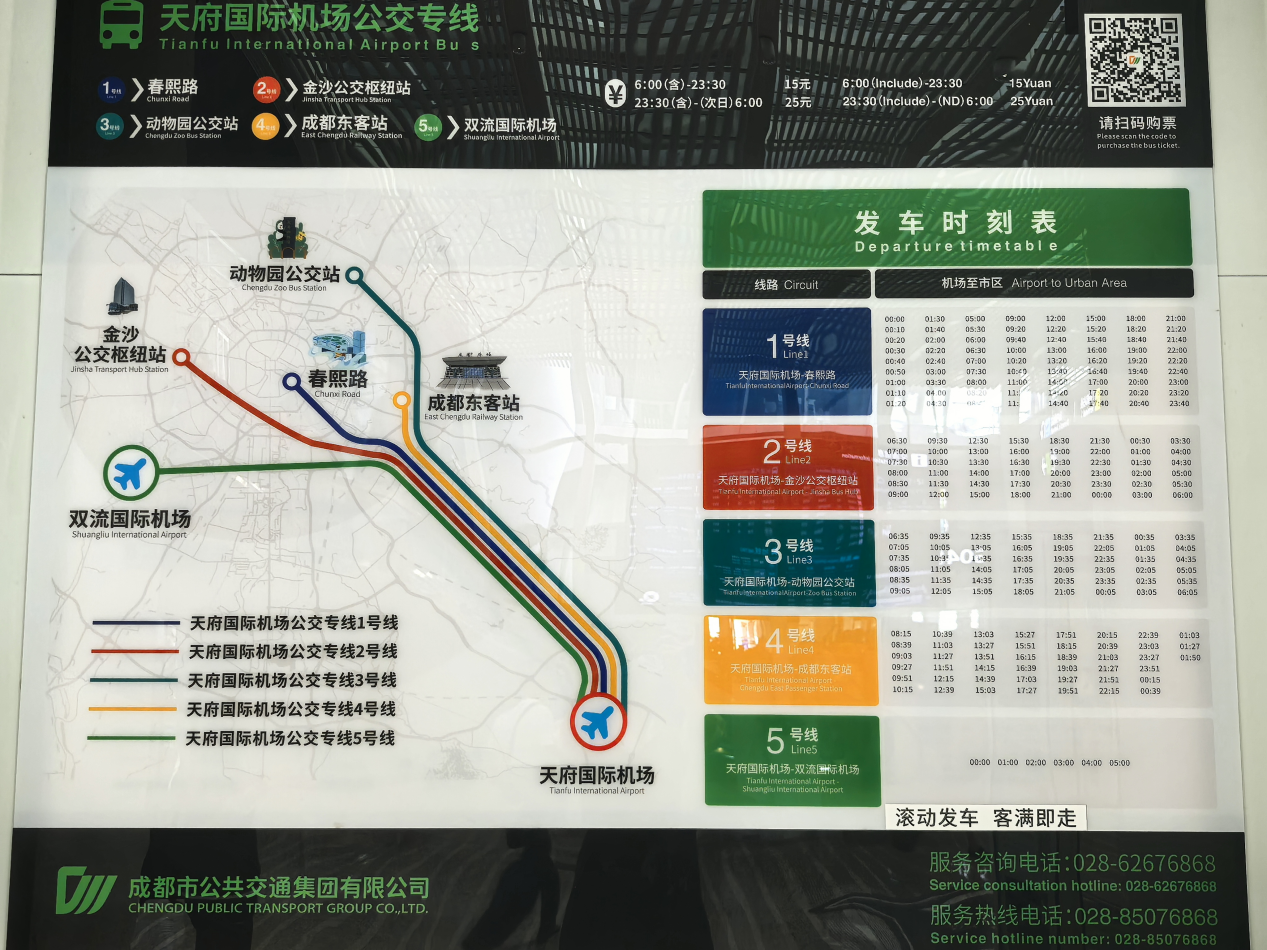 机场公交专线:由成都公交集团提供的天府国际机场公交专线共设5条线路,全天候24小时滚动发车,每隔10至30分钟一班,直达成都市区多个重要区域。这些线路高速直达,单程时间预计在50至100分钟之间,日间(06:00(含)-23:30)价格为15元,夜间(23:30(含)﹣次日06:00)价格为25元,为旅客提供了经济、实惠且可靠的出行方式。