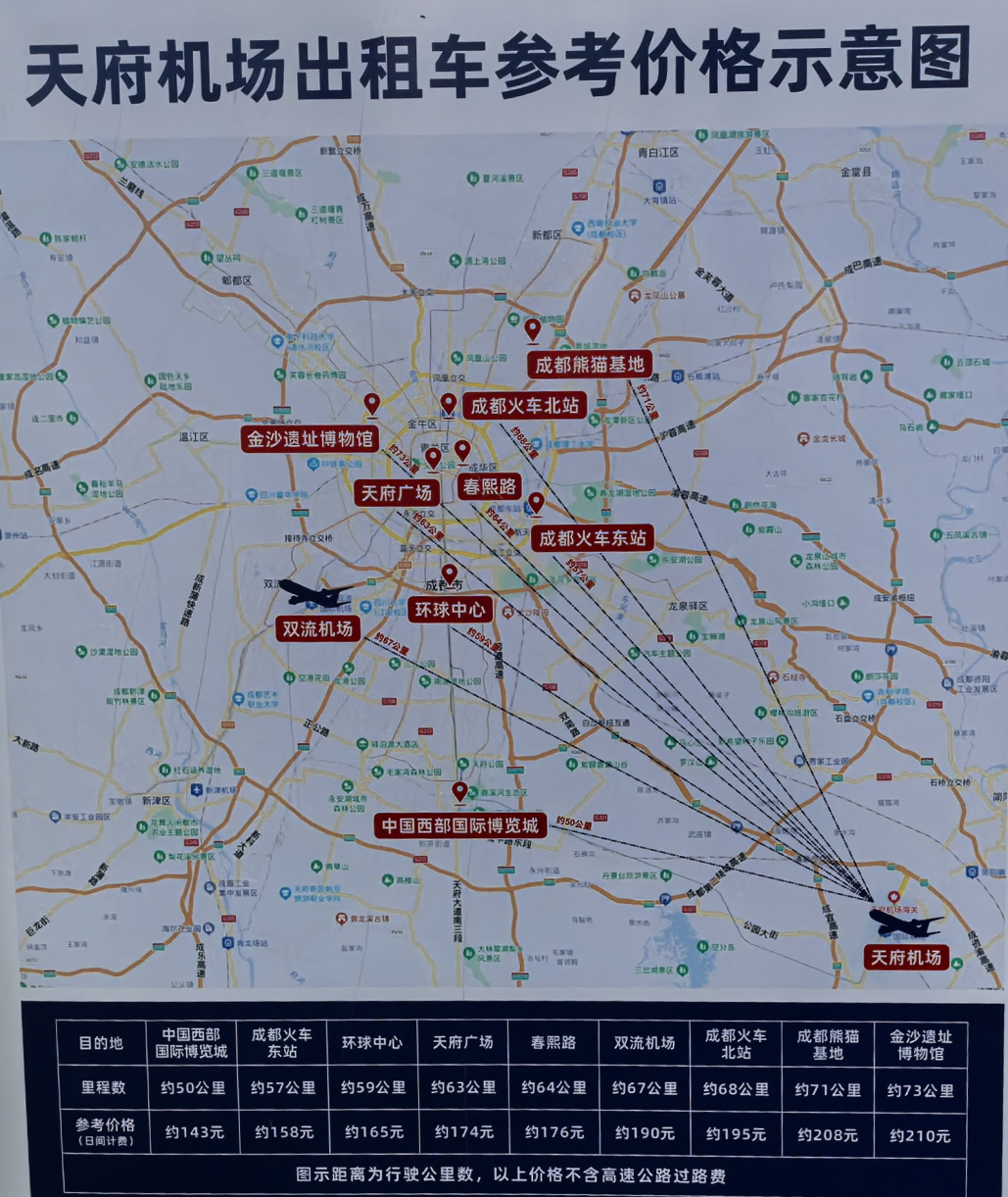出租车与网约车:作为灵活便捷的出行方式,出租车和网约车在天府机场同样为旅客提供服务。机场内设有出租车乘车点、网约车乘车点,并摆放有出租车价位参考示意图,供旅客参考。同时,在此,提醒广大旅客选择正规的出租车公司和网约车平台,避免乘坐黑车或遭遇临时加价情况。