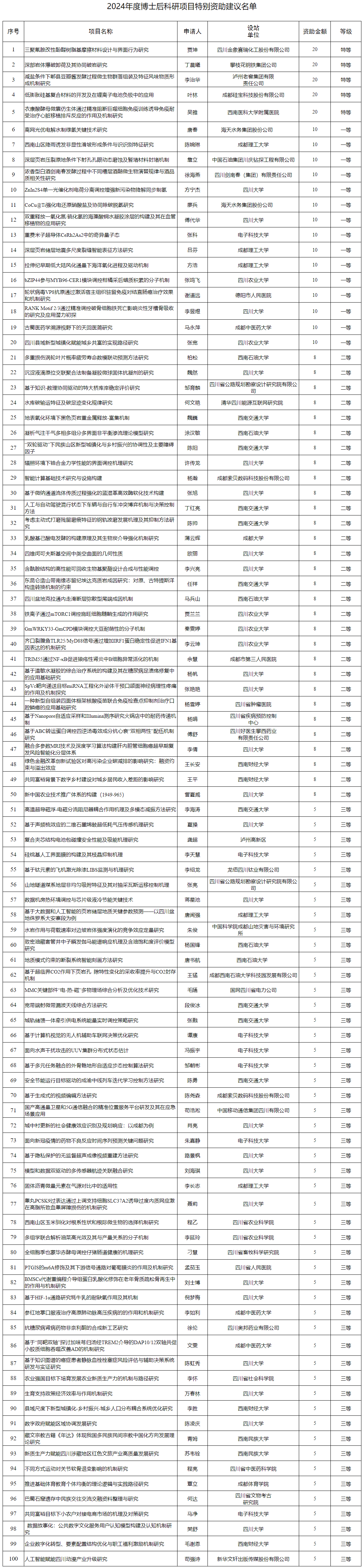 8月12日,四川省人力资源和社会保障厅公示2024年度博士后科研项目特别资助建议项目。经专家评议,共推荐产生100个建议项目,公示期为5个工作日(2024年8月12日至16日)。