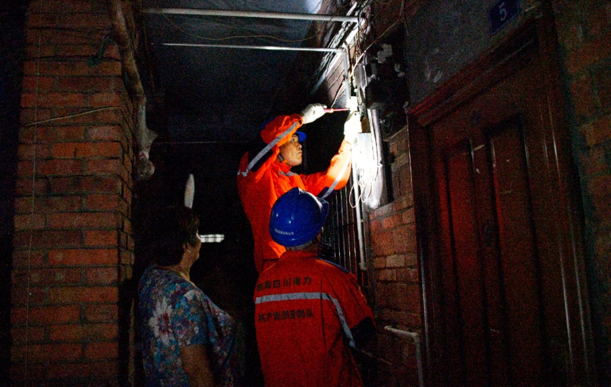 8月12日21时许,在自贡市自流井区三台寺社区,国网四川电力(自贡)连心桥共产党员服务队队员詹立波、袁振正在仔细排查用电线路,快速处理居民自有开关过热引发的用电故障。“我们24小时不间断服务,7月以来已经上门为群众处理用电故障500多次。”詹立波介绍说。