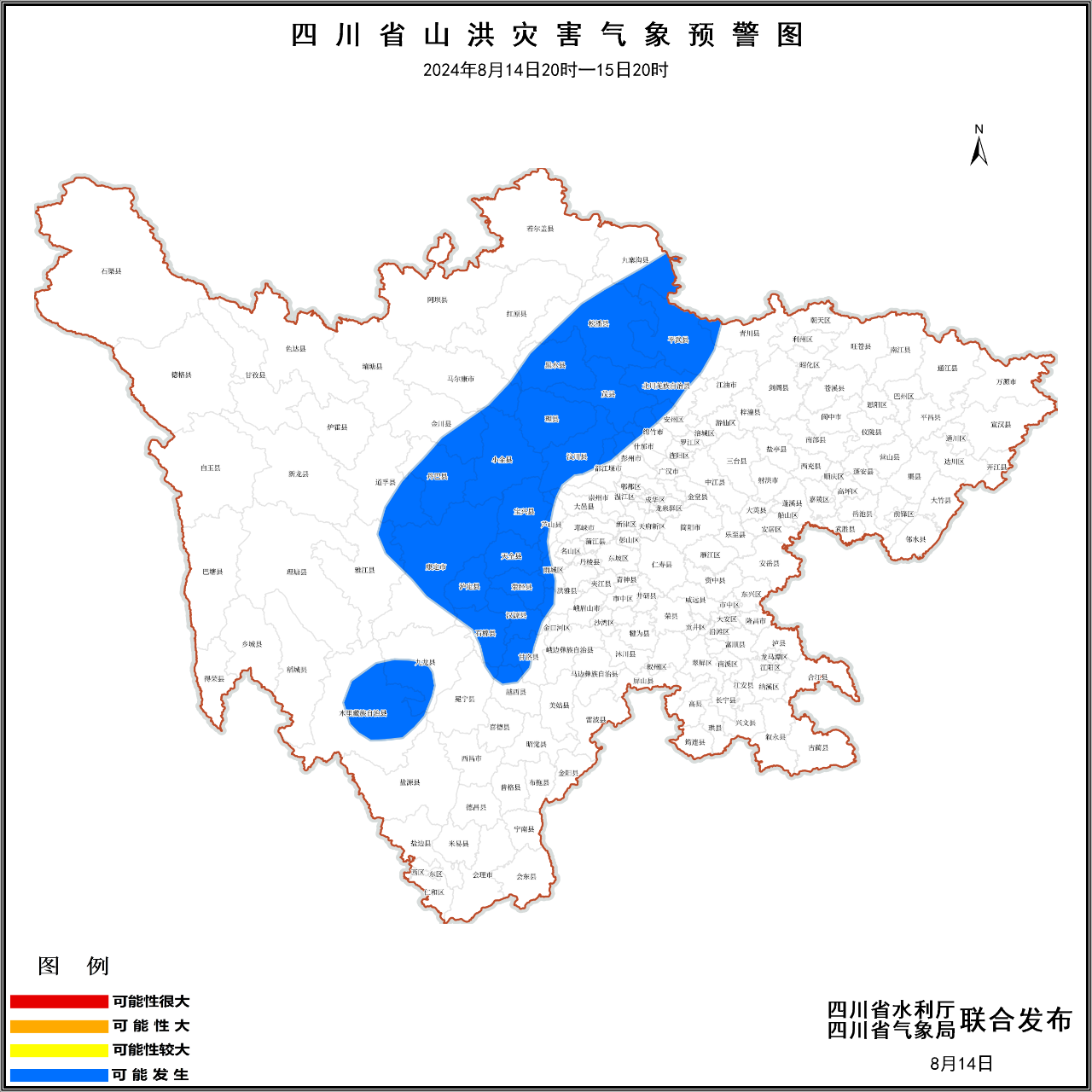 2024年8月14日20时至15日20时,成都市大邑、都江堰、彭州,德阳市什邡、绵竹,绵阳市安州、北川、平武,广元市青川,眉山市洪雅,雅安市雨城、荥经、汉源、石棉、天全、芦山、宝兴,阿坝州马尔康、汶川、理县、茂县、松潘、九寨沟、金川、小金、黑水、红原,甘孜州康定、泸定、丹巴、九龙、雅江、道孚,凉山州木里、冕宁、越西、甘洛等37个县(市、区)可能发生山洪灾害。