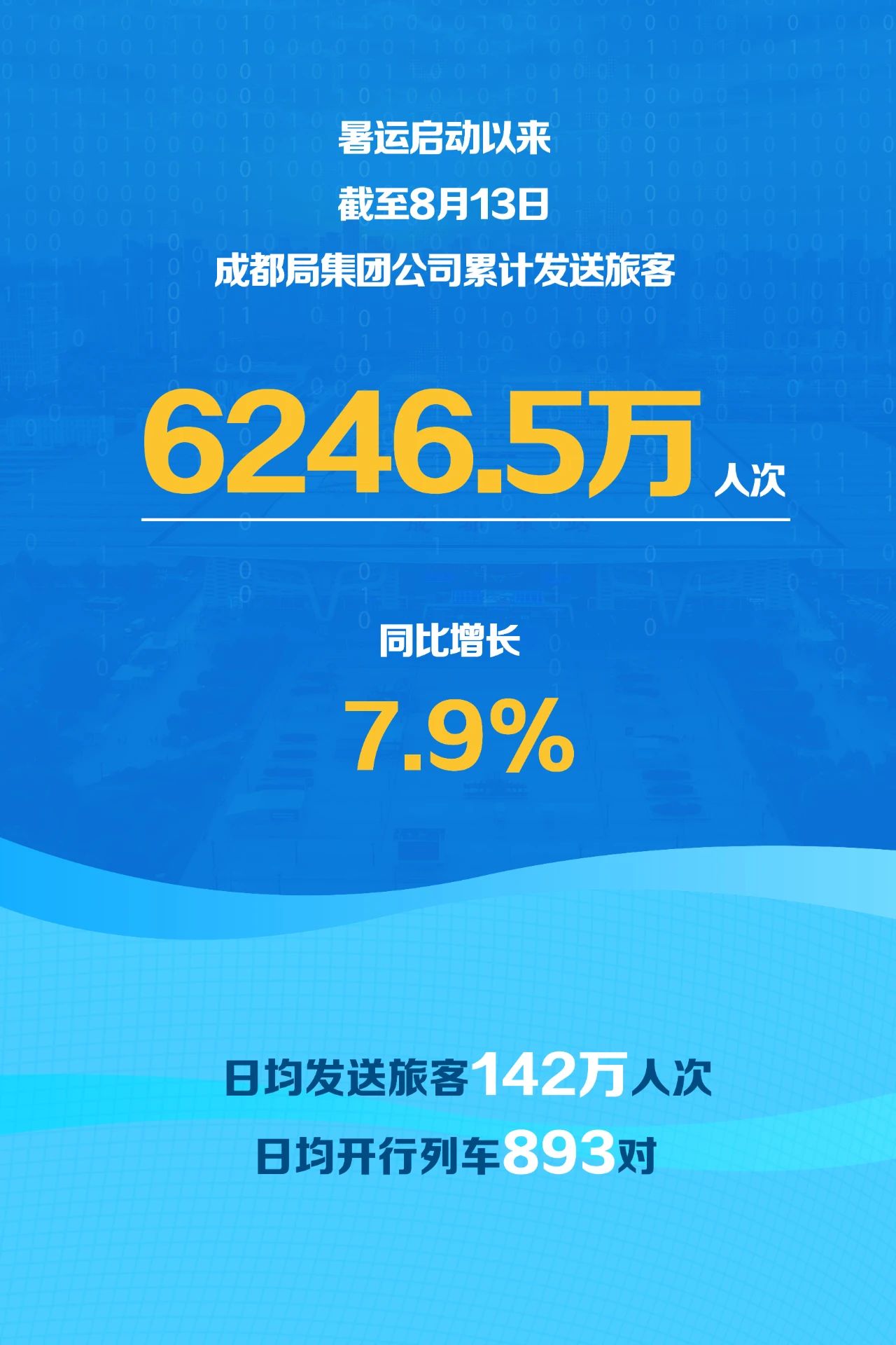 暑运启动以来截至8月13日,成都局集团公司累计发送旅客6246.5万人次,同比增长7.9%,日均发送旅客142万人次,日均开行列车893对,铁路运输安全平稳有序。