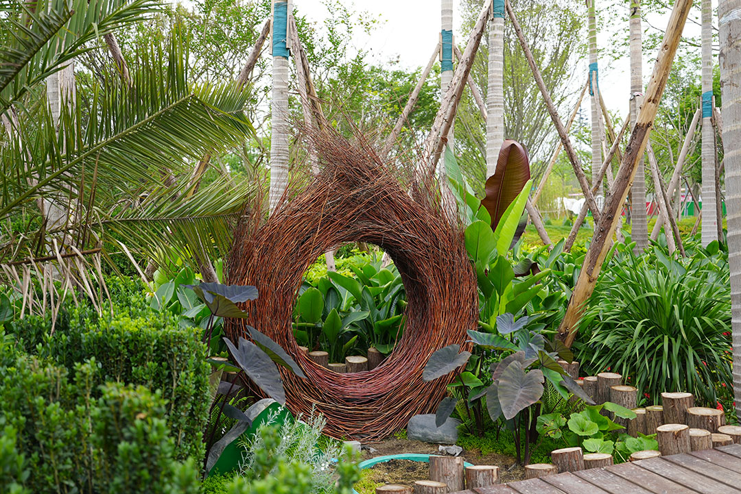 缅甸曼德勒展园面积1501平方米,在设计理念上提取了曼德勒独有的城市符号、文化、元素及色彩,再与造园手法相结合,力求将神秘而美丽的曼德勒呈现在世园会主会场,展现“神秘之境、多宝之城”的独特魅力。