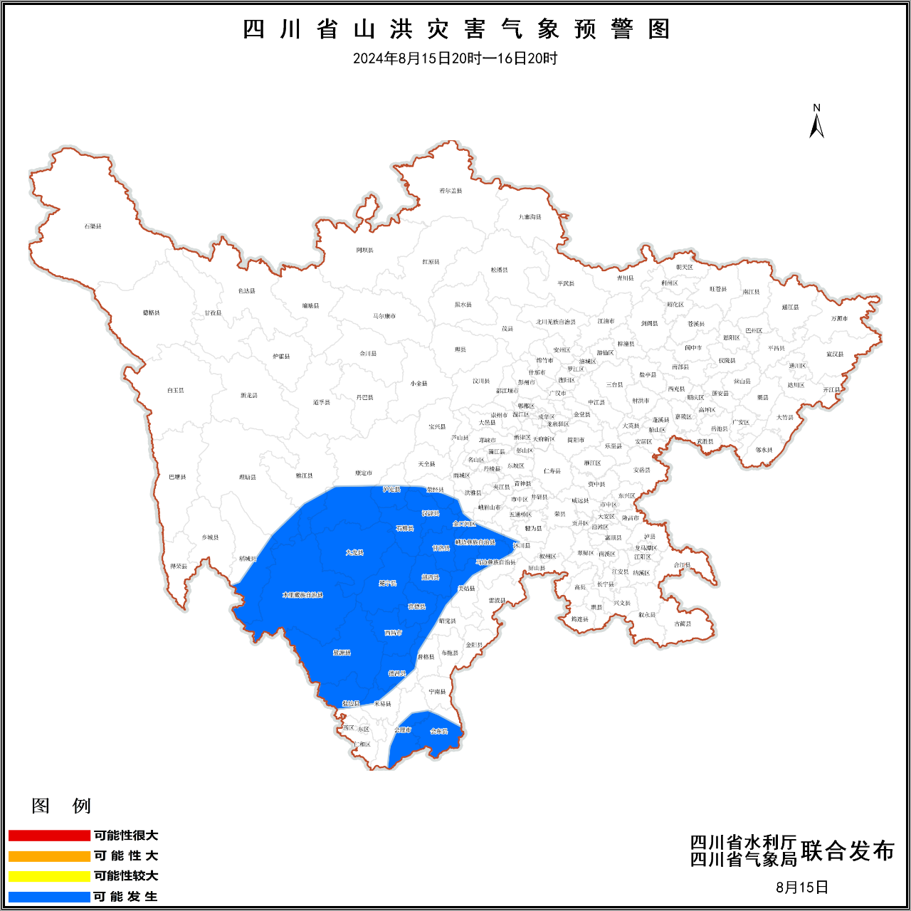 2024年8月15日20时至16日20时,攀枝花市米易、盐边,乐山市金口河、沐川、峨边、马边,眉山市洪雅,雅安市荥经、汉源、石棉,甘孜州康定、泸定、九龙、雅江、理塘、稻城,凉山州西昌、会理、木里、盐源、德昌、会东、普格、昭觉、喜德、冕宁、越西、甘洛、美姑等29个县(市、区)可能发生山洪灾害。