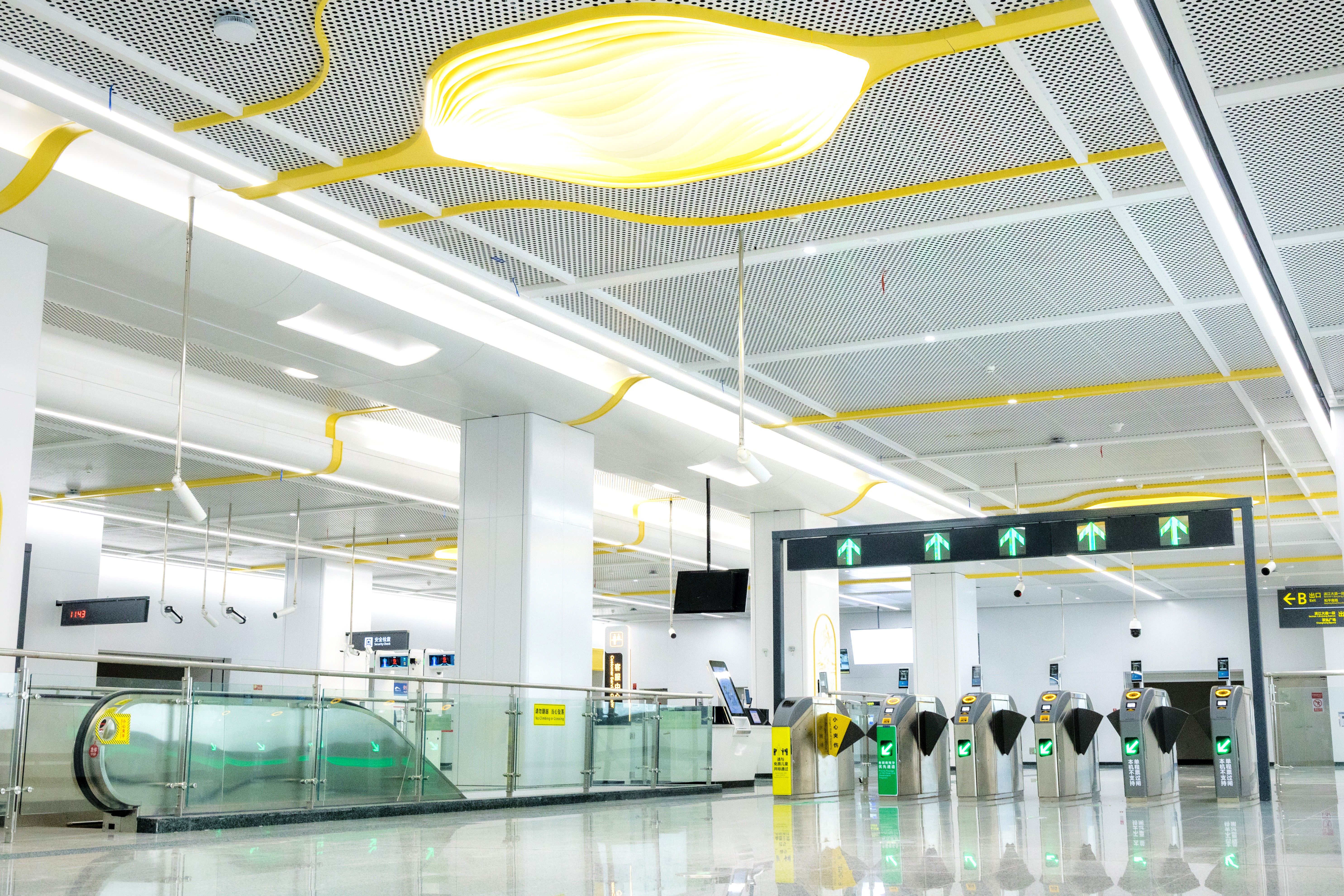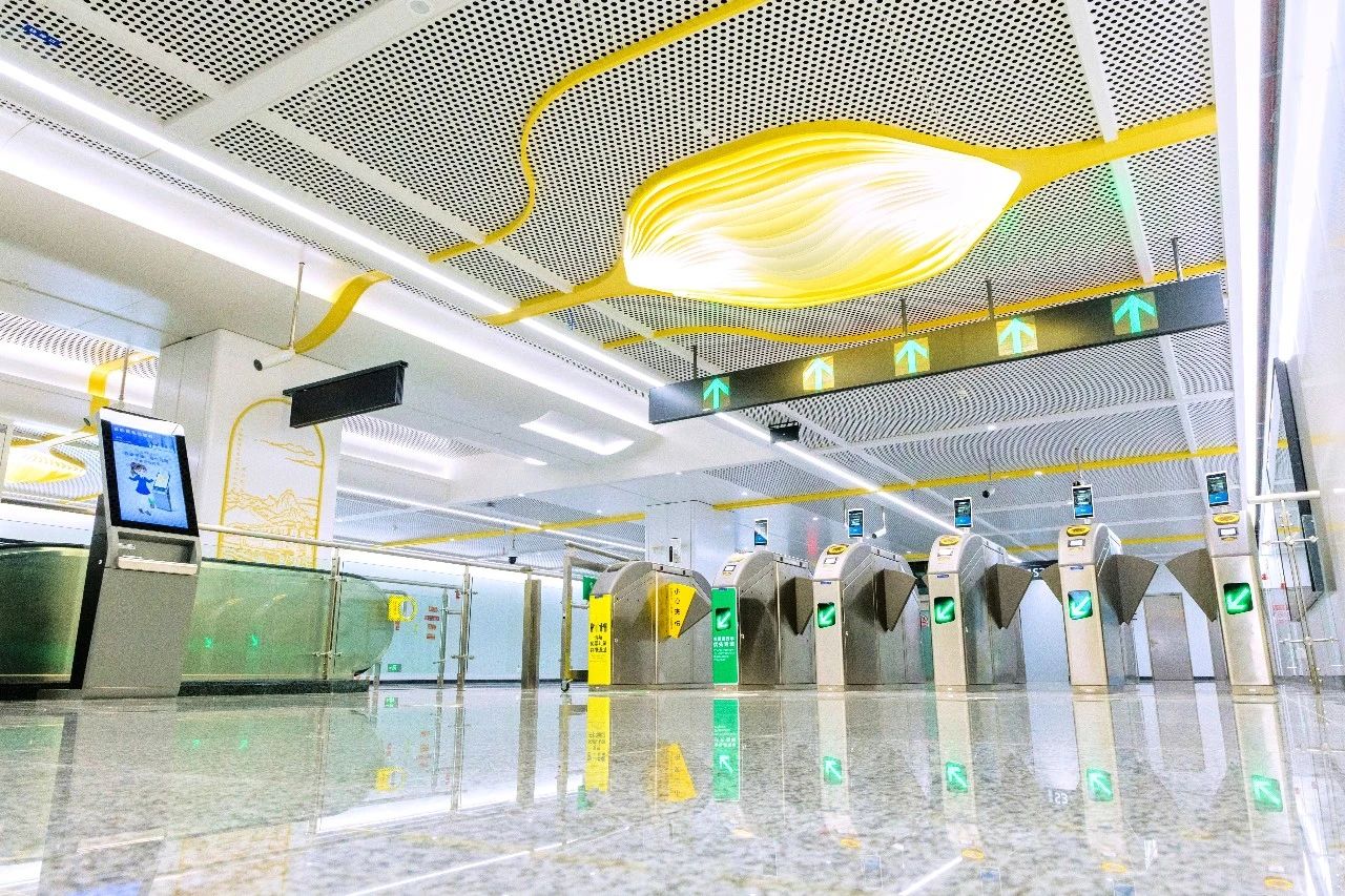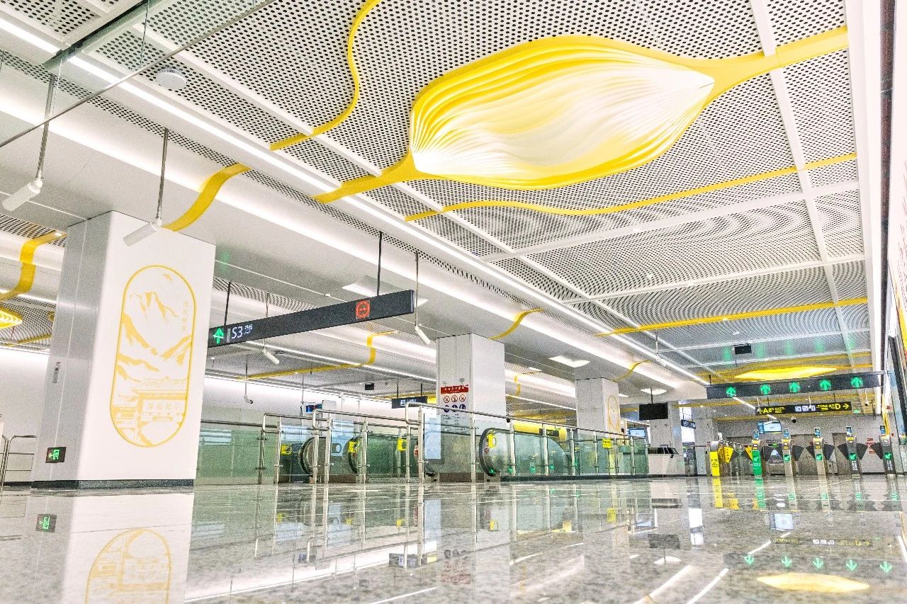 “设计团队运用现代化艺术手法,综合运用铝板、钢制复合板、花岗岩等材料,以檬黄与灰白为主色调,车站柱面以丝网印工艺展现安岳石刻、铜车马、三贤故里等文化元素,重点展示成都和资阳融合发展的新风貌。”成都轨道建设公司设计与前期中心副主任张昌国表示。