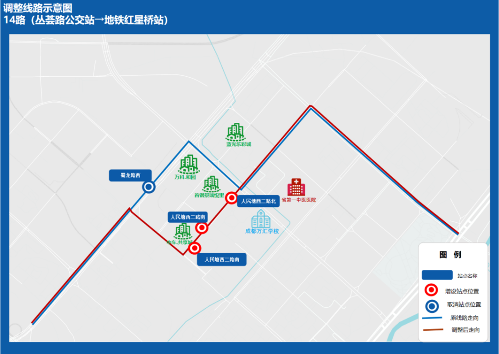 结合蜀龙路区域客流变化,拟调整14路走向,服务人民塘西二路、东瑞一路周边市民出行需求,强化东瑞一路公交服务功能。