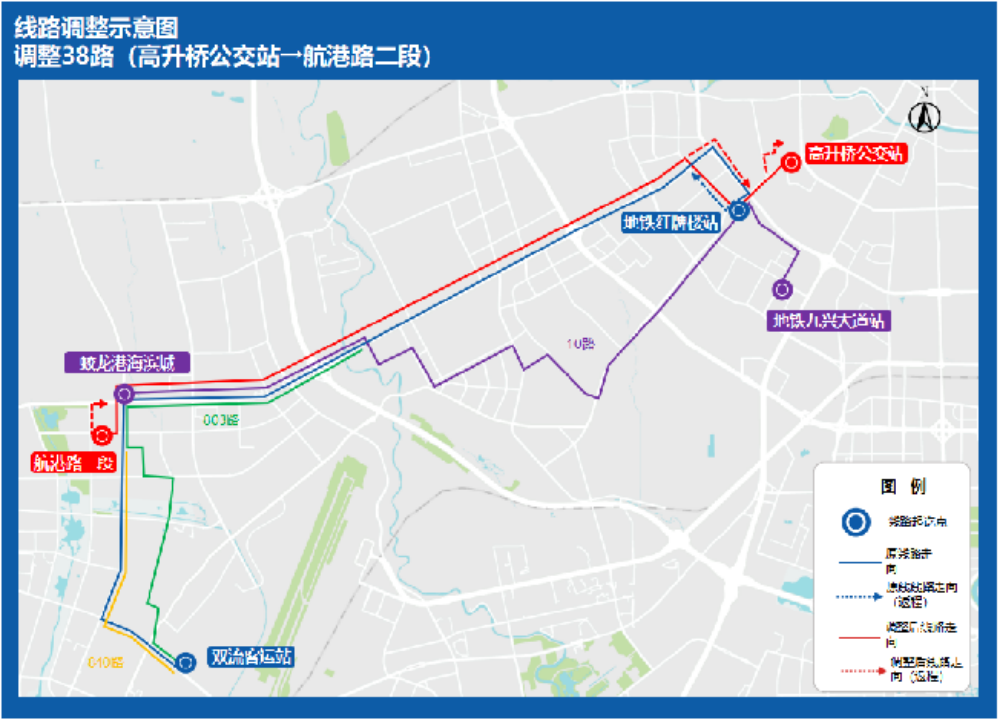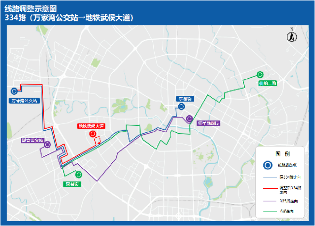 为提升武侯大道公交运行质效,拟将38路起讫点调整至高升桥公交站—航港路二段,334路终点调整至地铁武侯大道;调整后,两条线路高峰发车频率均缩短至6-7分钟。