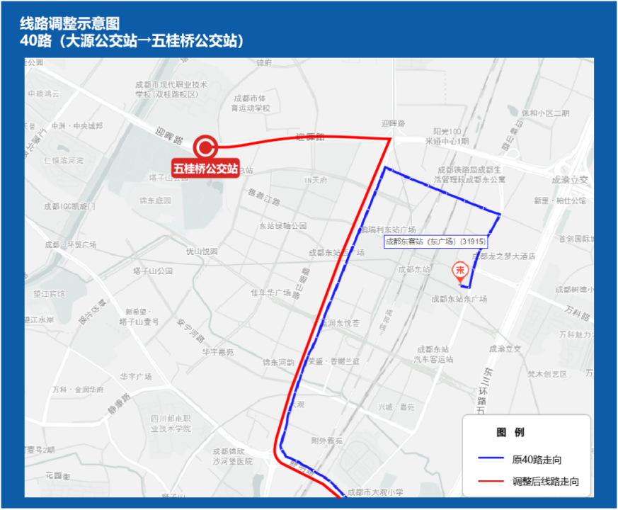 为方便五桂桥片区居民前往高新南区、换乘地铁7号线,拟将40路起讫点由成都东客站(东广场)调整至五桂桥公交站。